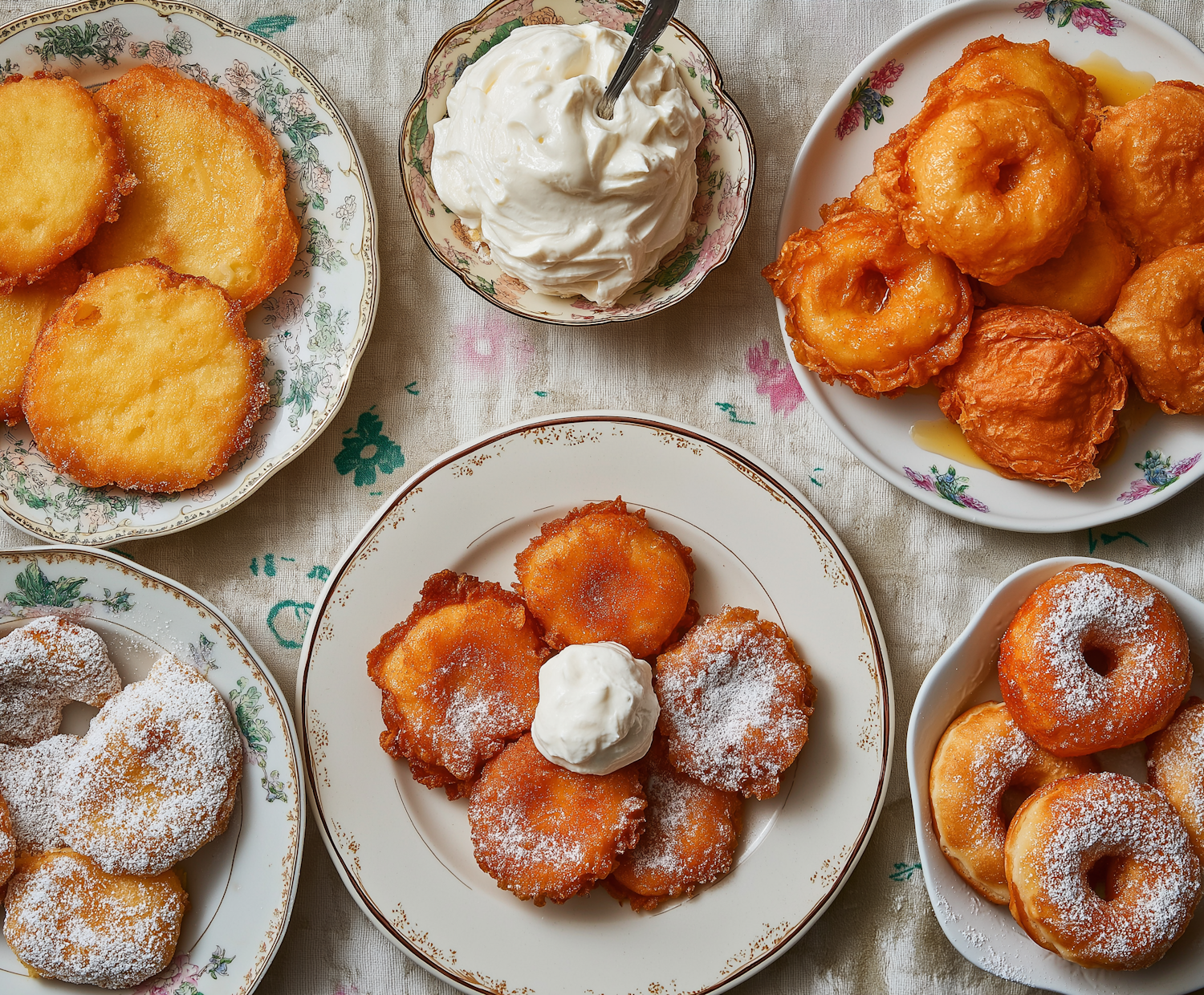Assorted fried pastries on floral plates with powdered sugar and cream, set on a vintage tablecloth.
