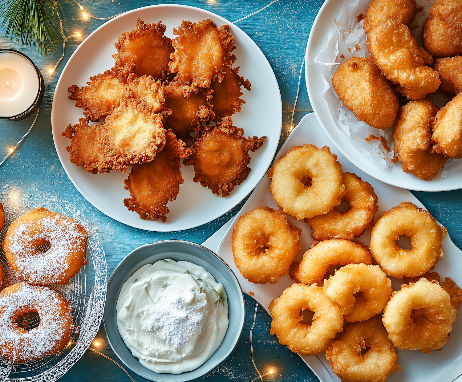 Delicious assortment of golden-brown fritters and donuts on a festive blue table with creamy dip, candle, and fairy lights.