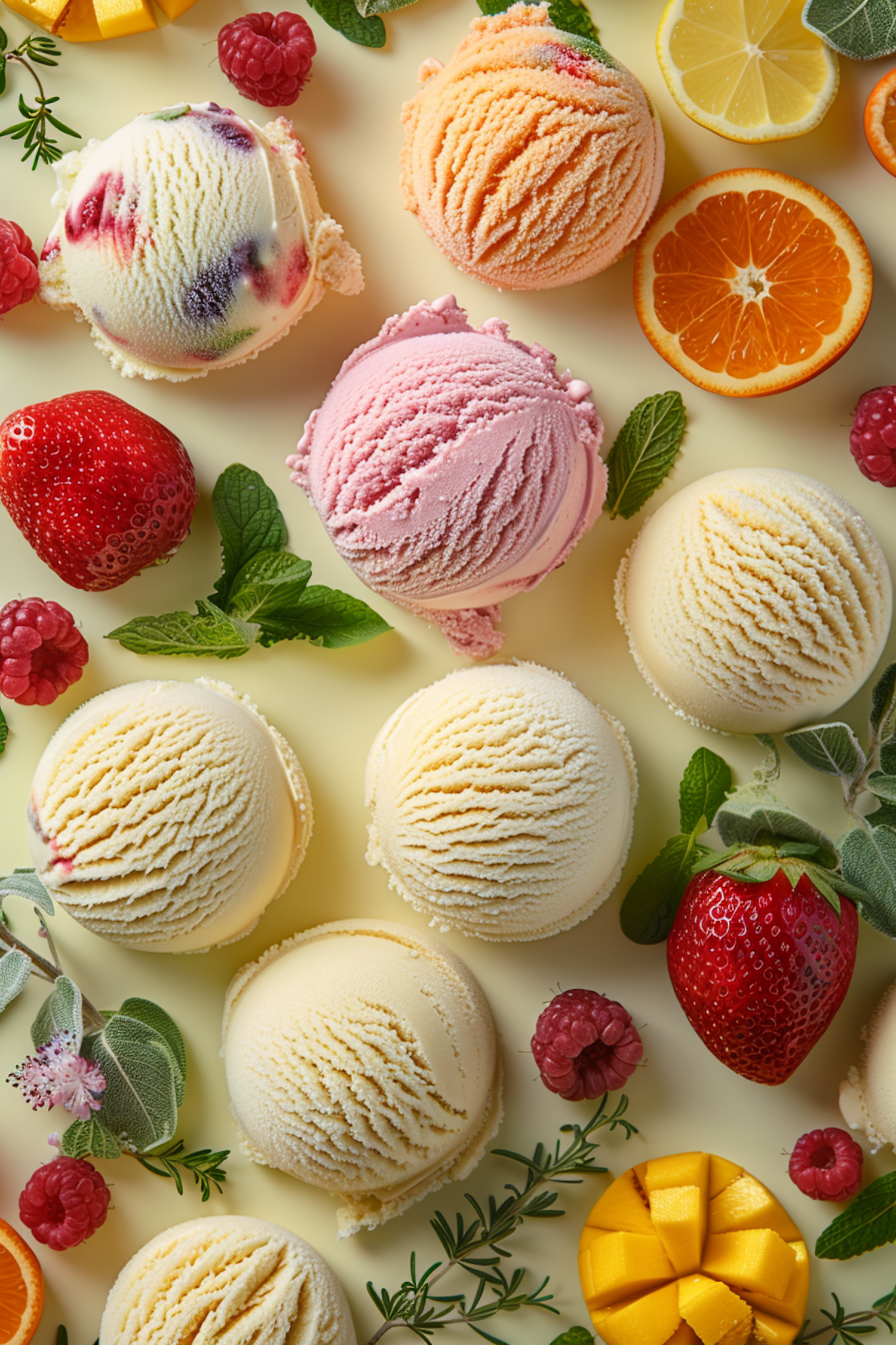Colorful ice cream scoops with fresh fruits and herbs on a pale yellow background, creating a vibrant and refreshing scene.