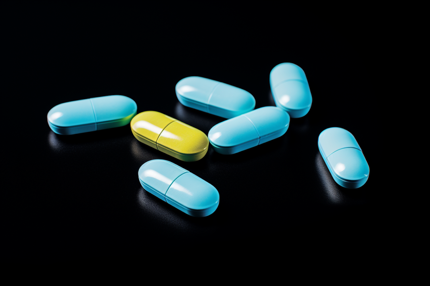 Bright cyan and yellow capsules scattered on a black surface, with glossy reflections and a sleek, modern aesthetic.