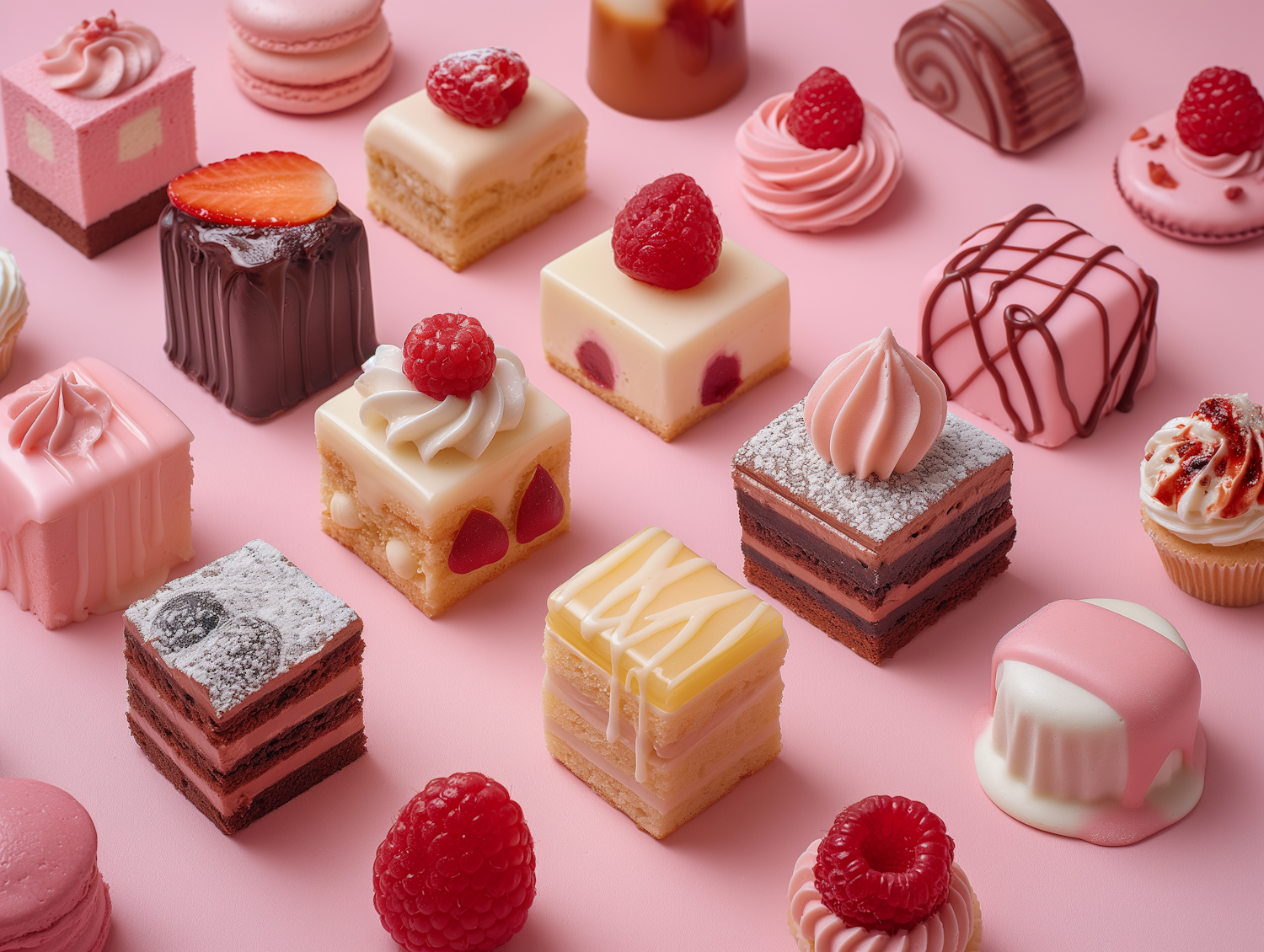 Elegant assortment of mini cakes, pastries, and macarons with vibrant toppings on a pastel pink background.