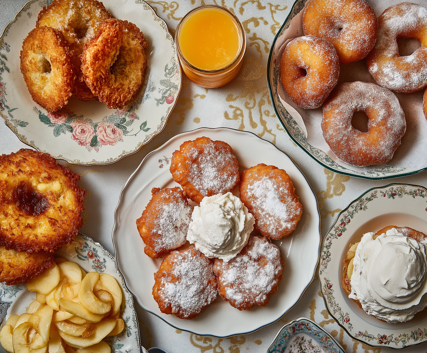 Assorted pastries with fritters, doughnuts, and whipped cream on floral plates, accompanied by orange juice and sliced apples.