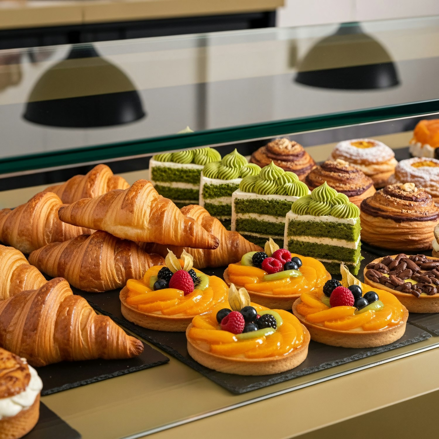 A tempting assortment of croissants, fruit tarts, matcha cakes, and cinnamon rolls displayed on a bakery counter.