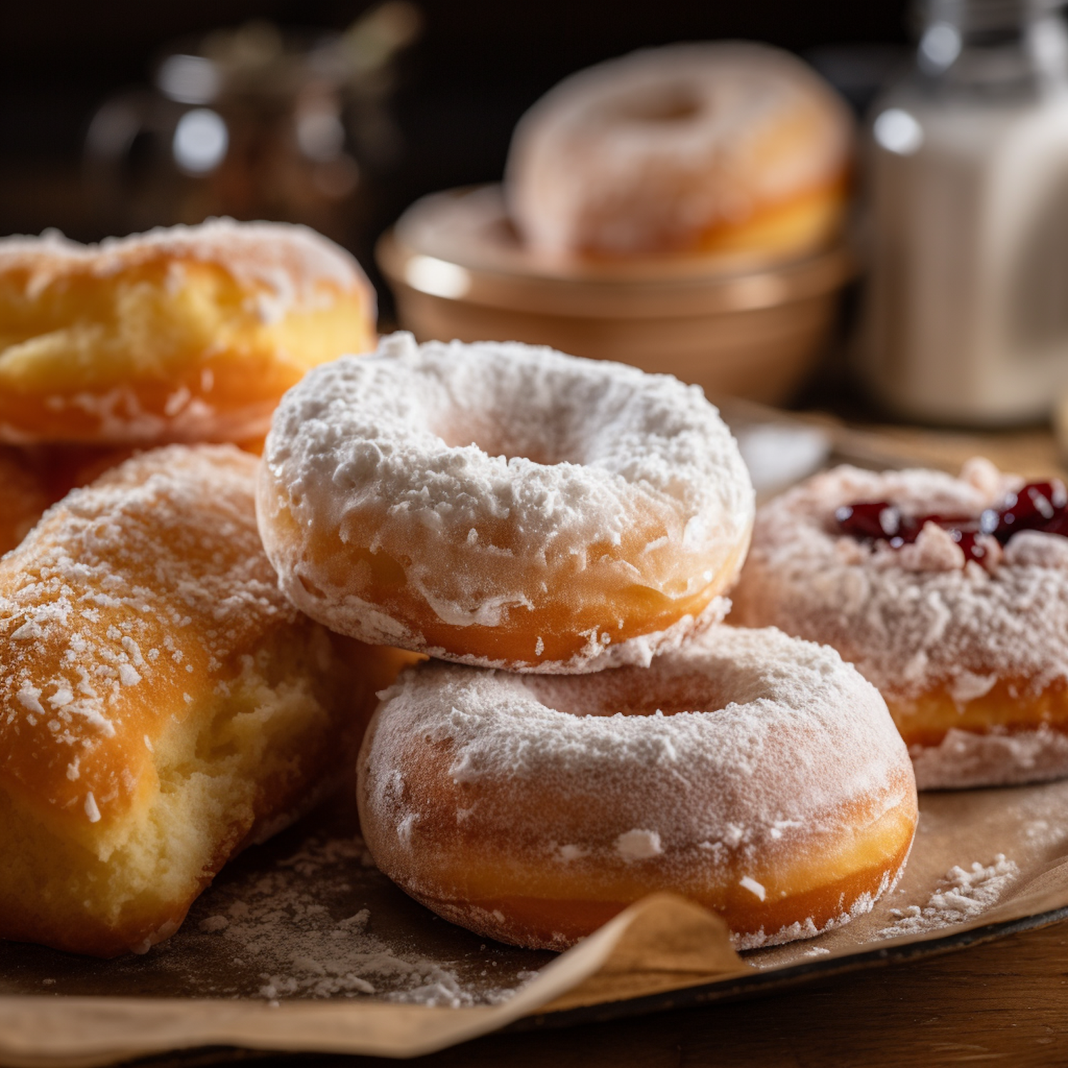 Delicious assortment of powdered sugar donuts with a jelly-filled treat, perfect for a sweet indulgence.
