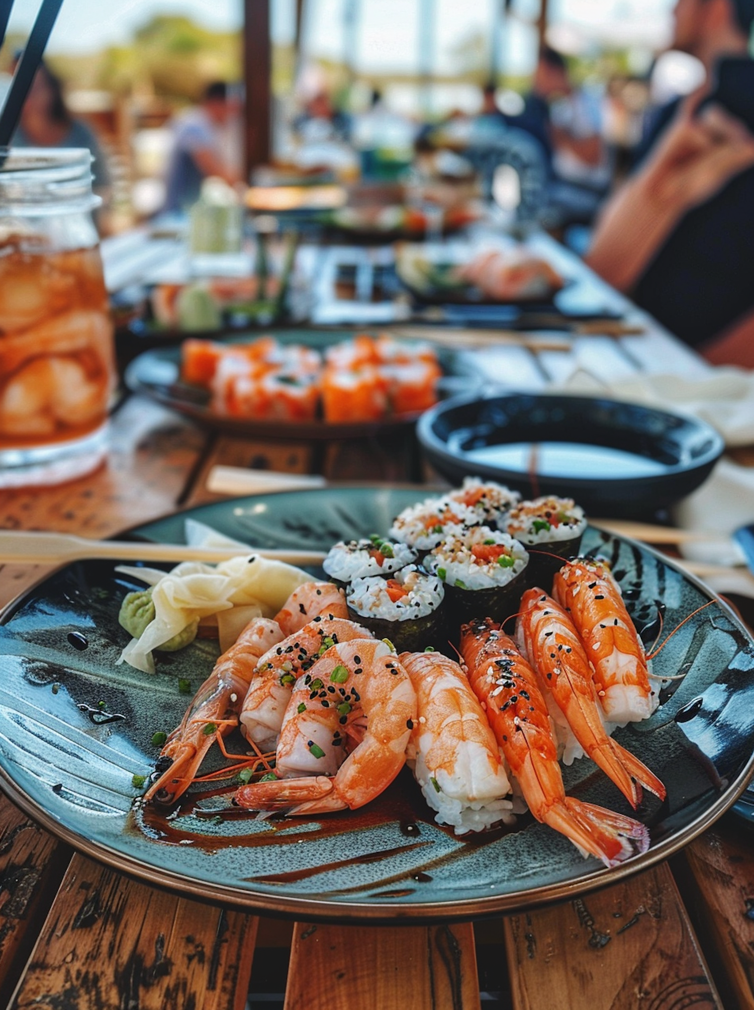 Vibrant sushi platter with shrimp nigiri and rolls, garnished with sesame seeds and green onions, set on a wooden table with iced tea.