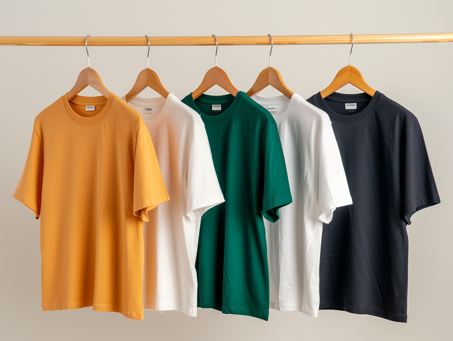 Five colorful t-shirts on wooden hangers: mustard, white, green, white, and black. Perfect for a minimalist wardrobe display.