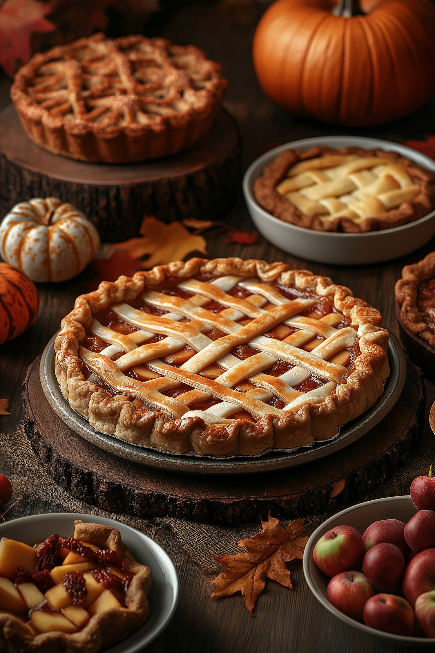 Autumn-themed scene with lattice pies, pumpkins, and apples, creating a cozy, rustic atmosphere perfect for fall gatherings.