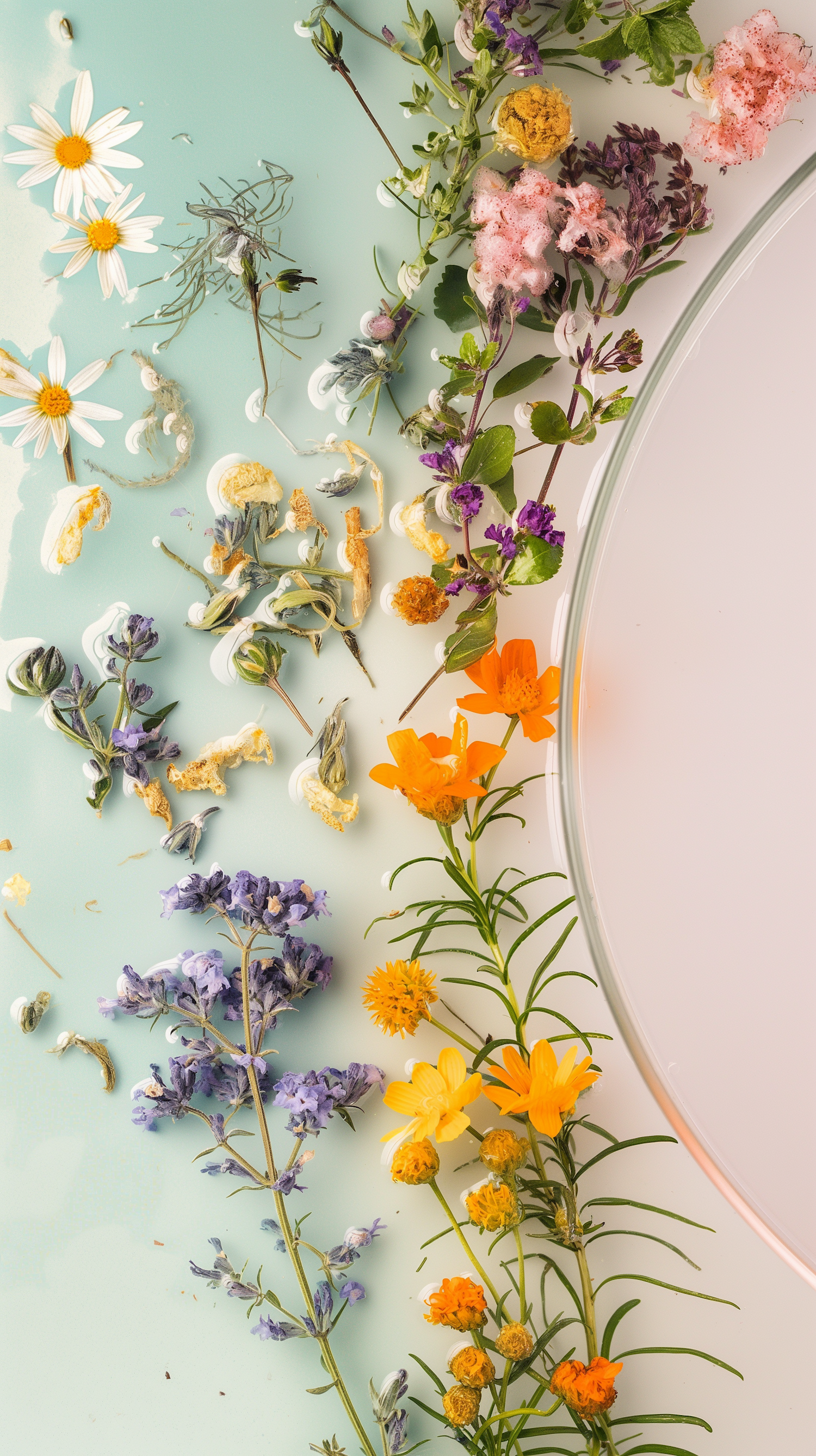 Colorful floral arrangement on a turquoise background with daisies, lavender, and vibrant orange flowers. Artistic and modern composition.