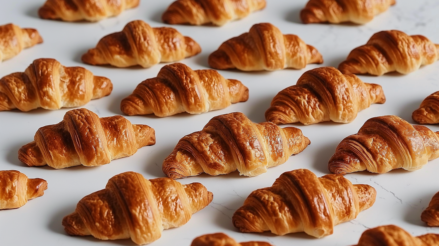 Golden-brown croissants arranged on a white marble surface, showcasing flaky layers and a glossy finish.