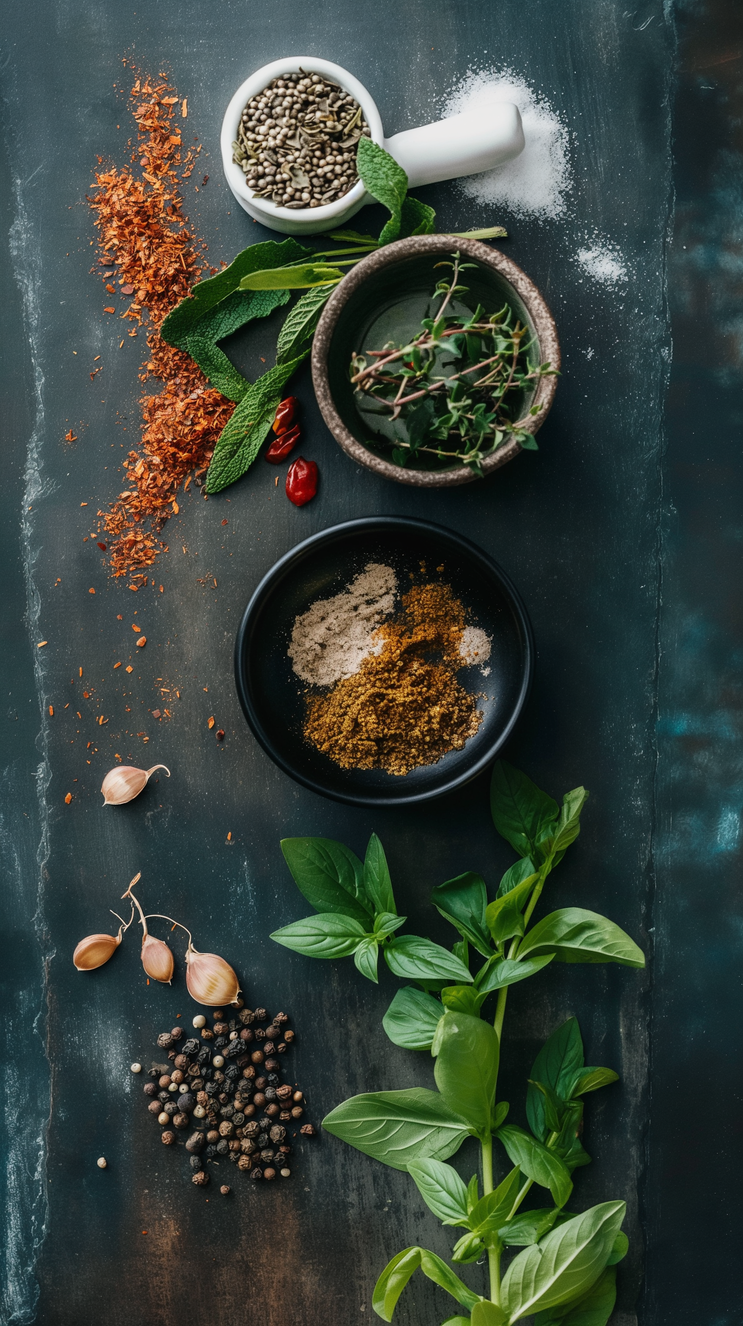 A vibrant arrangement of spices and herbs on a dark surface, featuring basil, thyme, peppercorns, and a mortar with seeds.