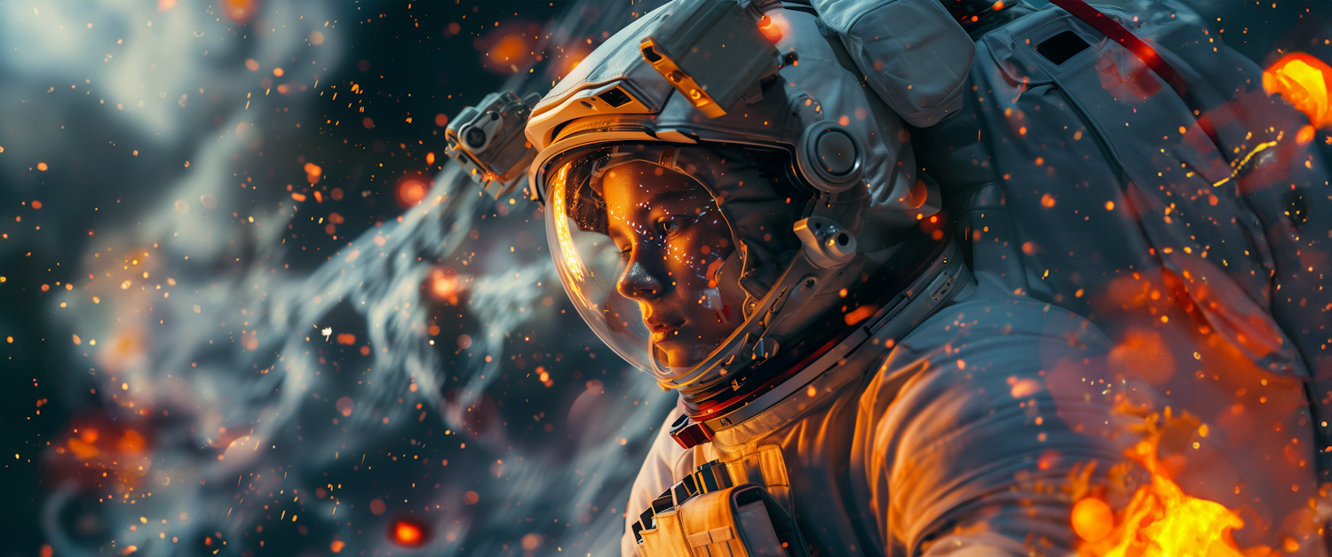 Astronaut in a fiery scene with glowing embers and smoke, reflecting intense light on the helmet. Dramatic and dynamic space exploration image.