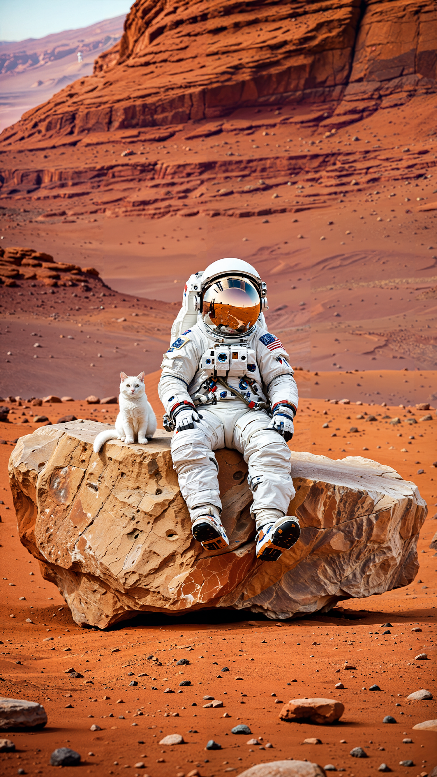 Astronaut and white cat on a Martian landscape, sitting on a rock with red cliffs in the background, creating a surreal scene.