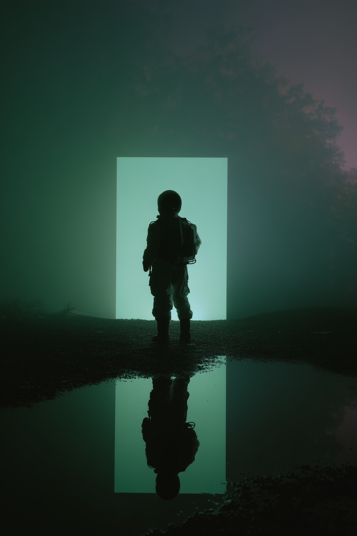 A silhouetted astronaut stands before a glowing portal in a misty, green-lit environment, with their reflection visible in a puddle.
