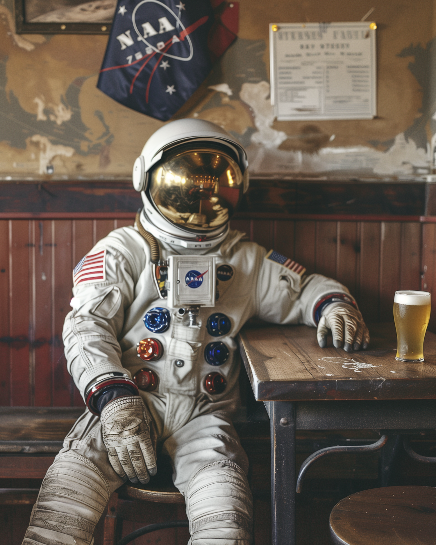 Astronaut in full suit enjoys a pint in a rustic bar, blending space exploration with casual leisure in a humorous setting.