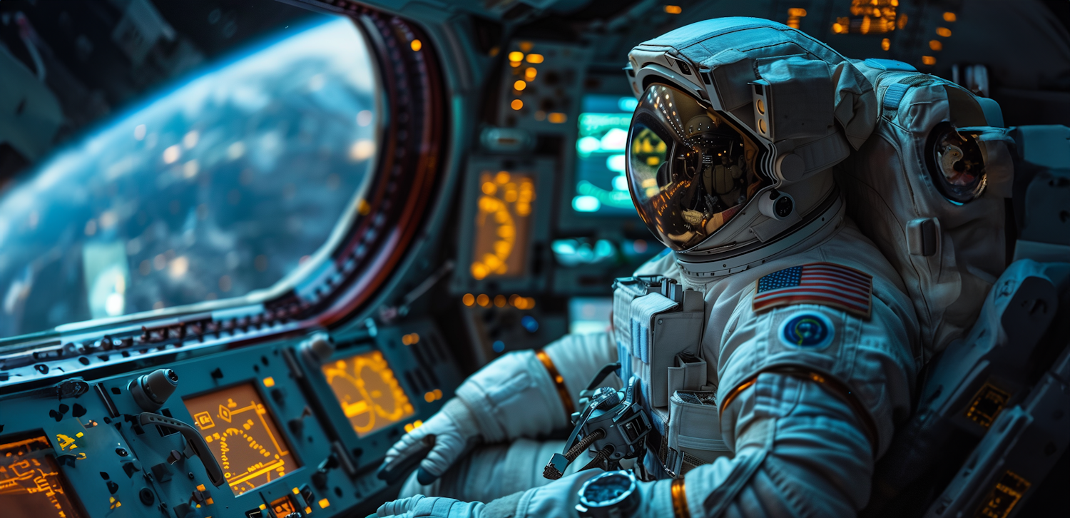 Astronaut in a spacecraft cockpit with Earth visible through the window, surrounded by glowing control panels and instruments.