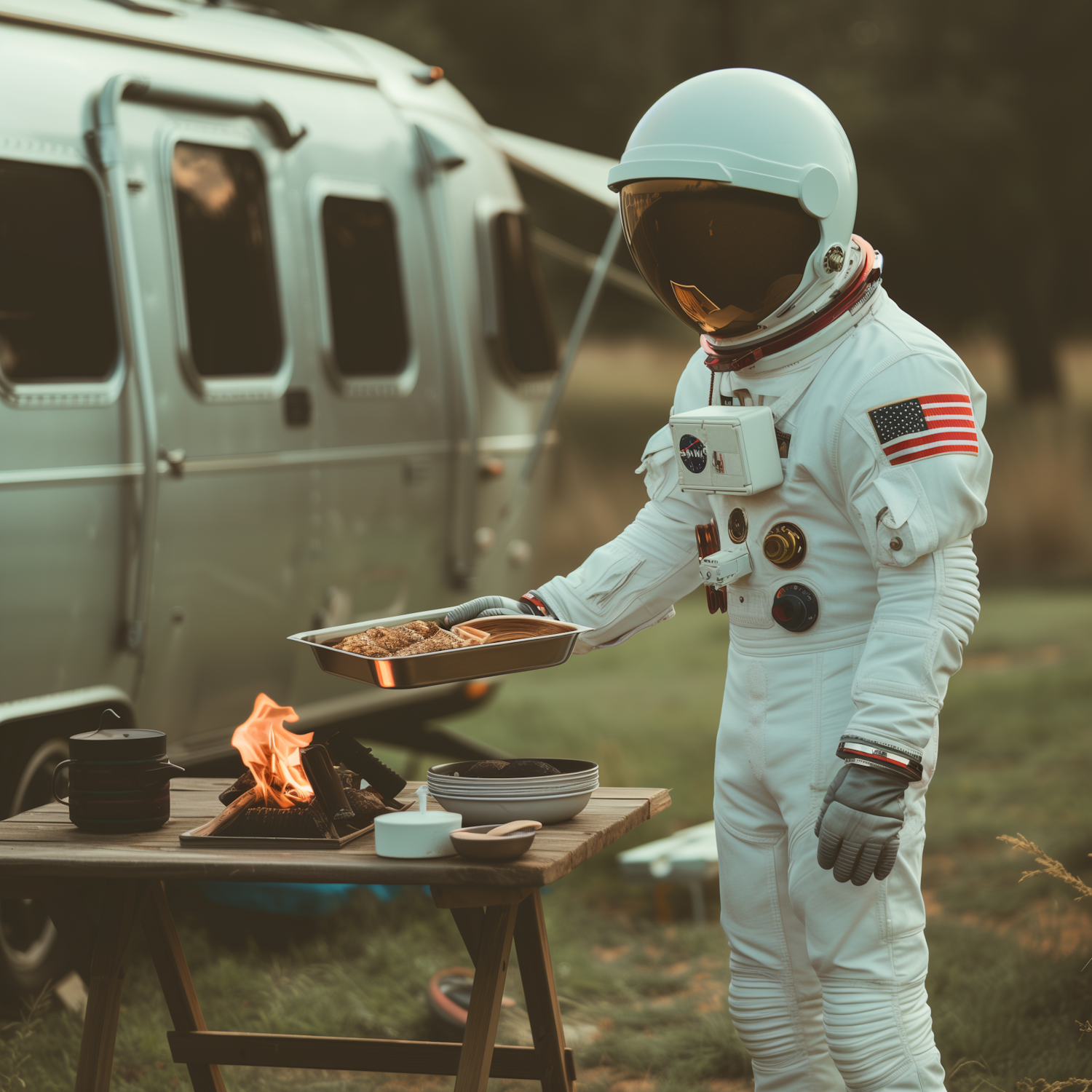 Astronaut in a space suit grilling food near an Airstream trailer, blending space exploration with outdoor camping vibes.