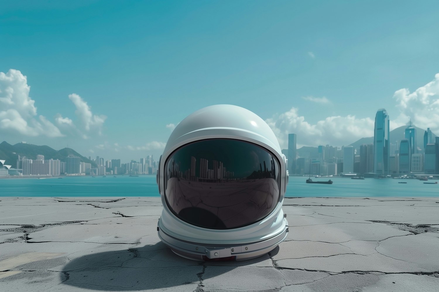 A white astronaut helmet on cracked concrete with a modern city skyline and calm waterfront in the background under a bright blue sky.