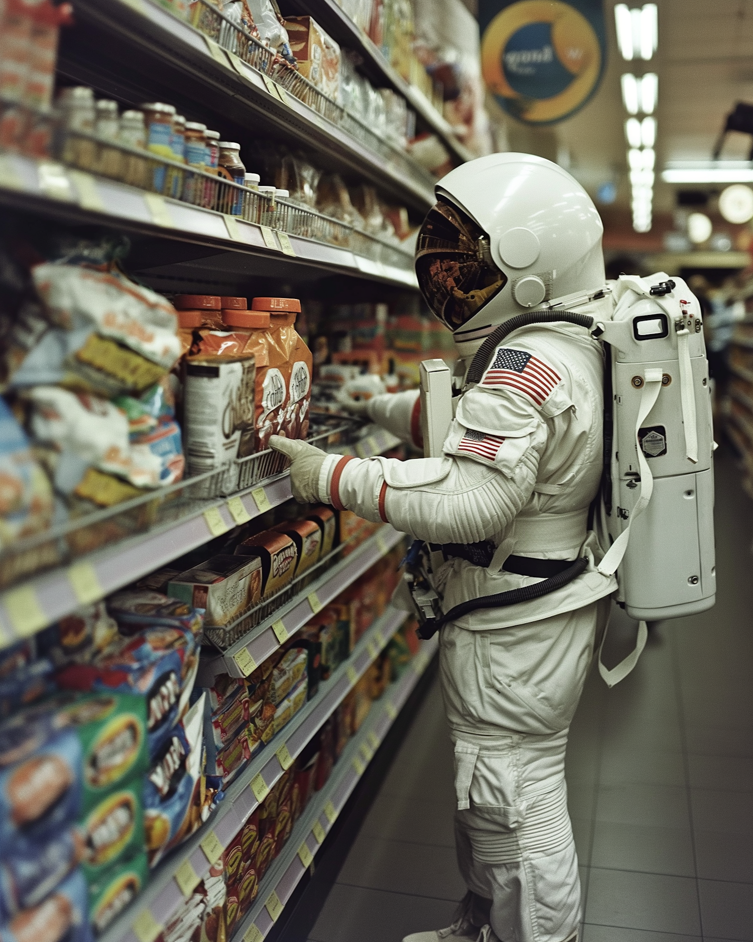 An astronaut in a space suit shops in a grocery store aisle, creating a surreal contrast between space exploration and everyday life.