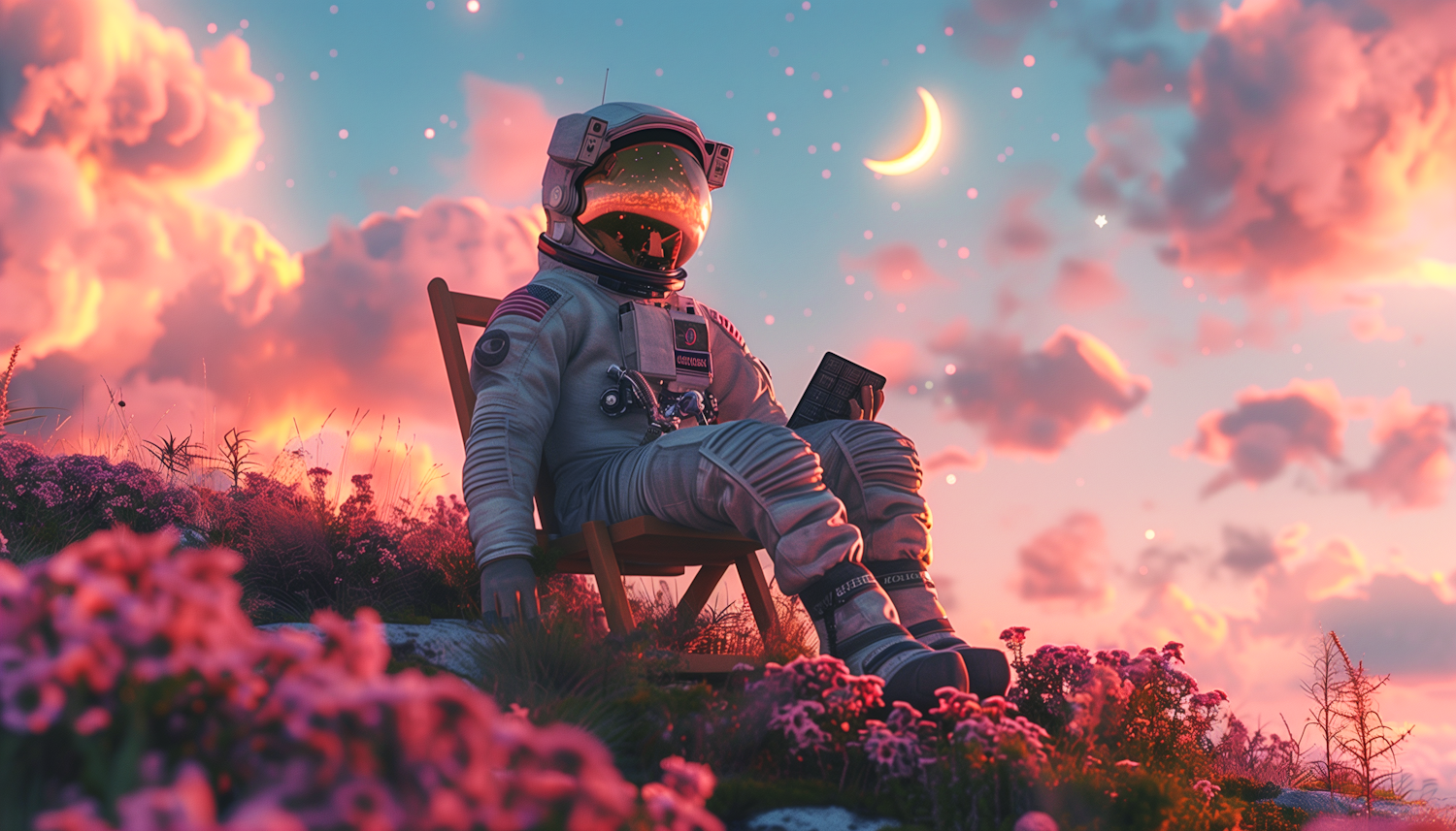 Astronaut in a field of pink flowers, reading under a dreamy sky with clouds and a crescent moon. Surreal and peaceful atmosphere.