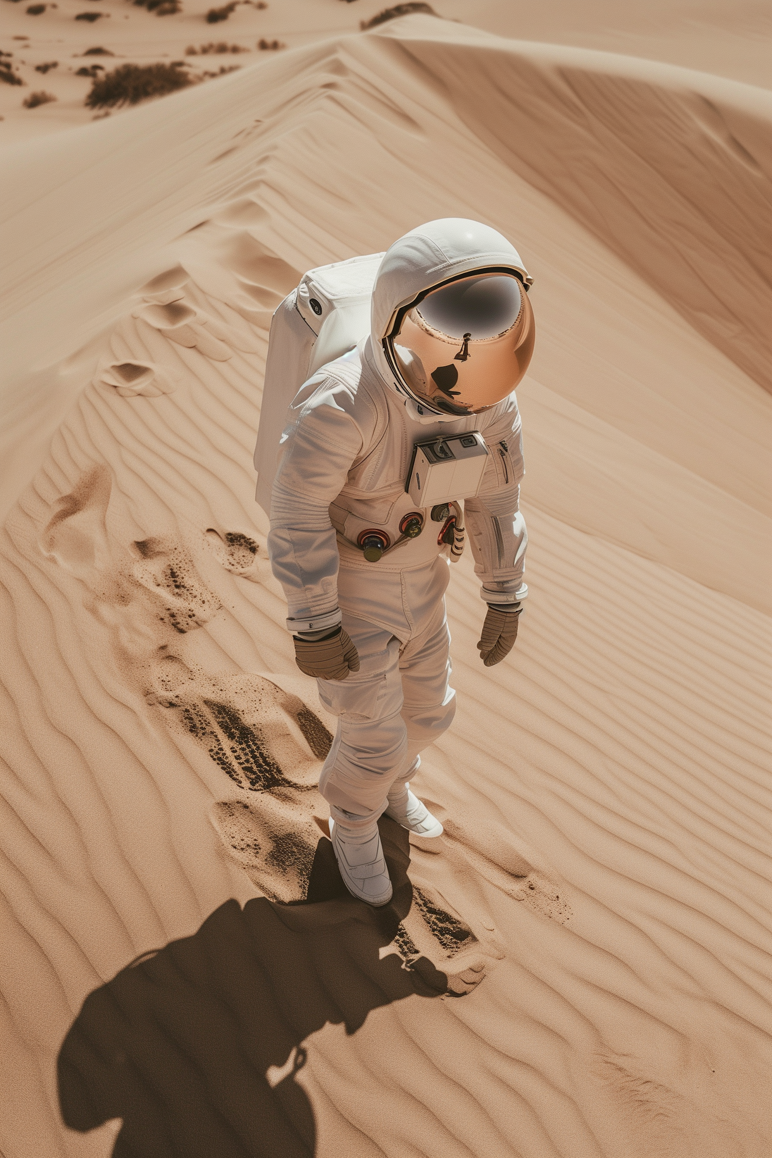 Astronaut in a white suit explores a vast desert, leaving footprints on the sand. Reflective visor and warm tones create a surreal scene.