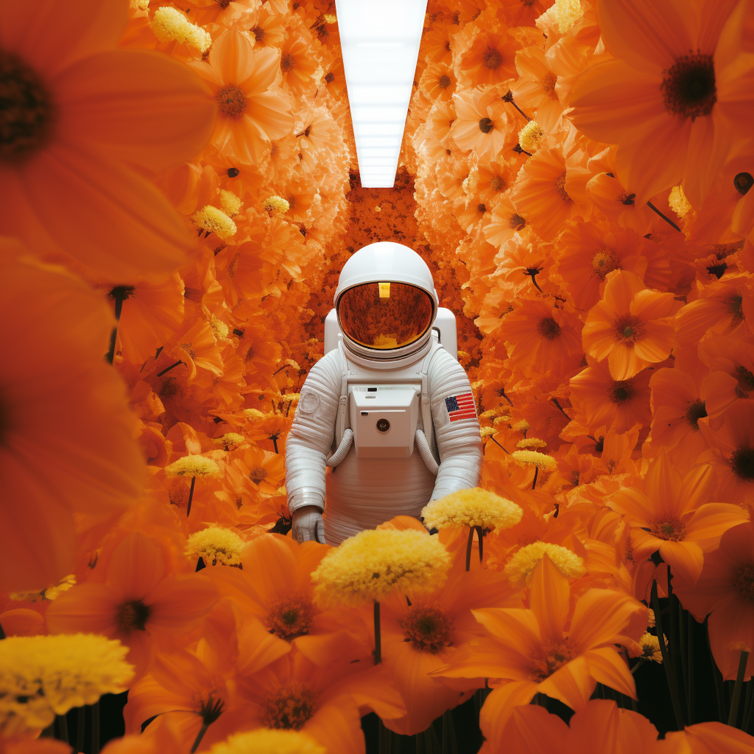 An astronaut in a white suit stands in a vibrant tunnel of orange and yellow flowers, blending space exploration with surreal nature.