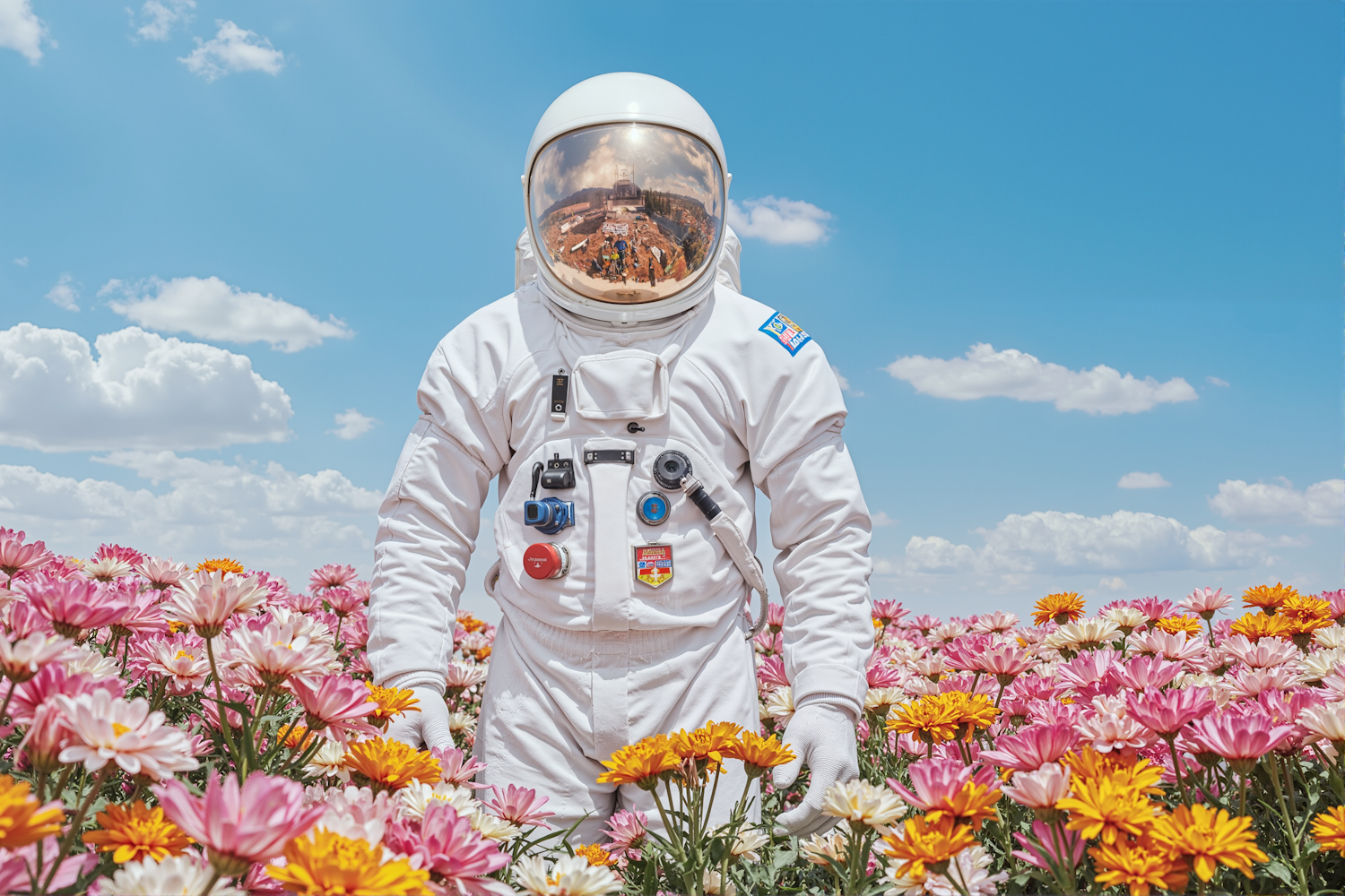 Astronaut in a white suit stands in a colorful flower field under a blue sky, blending space exploration with nature's beauty.