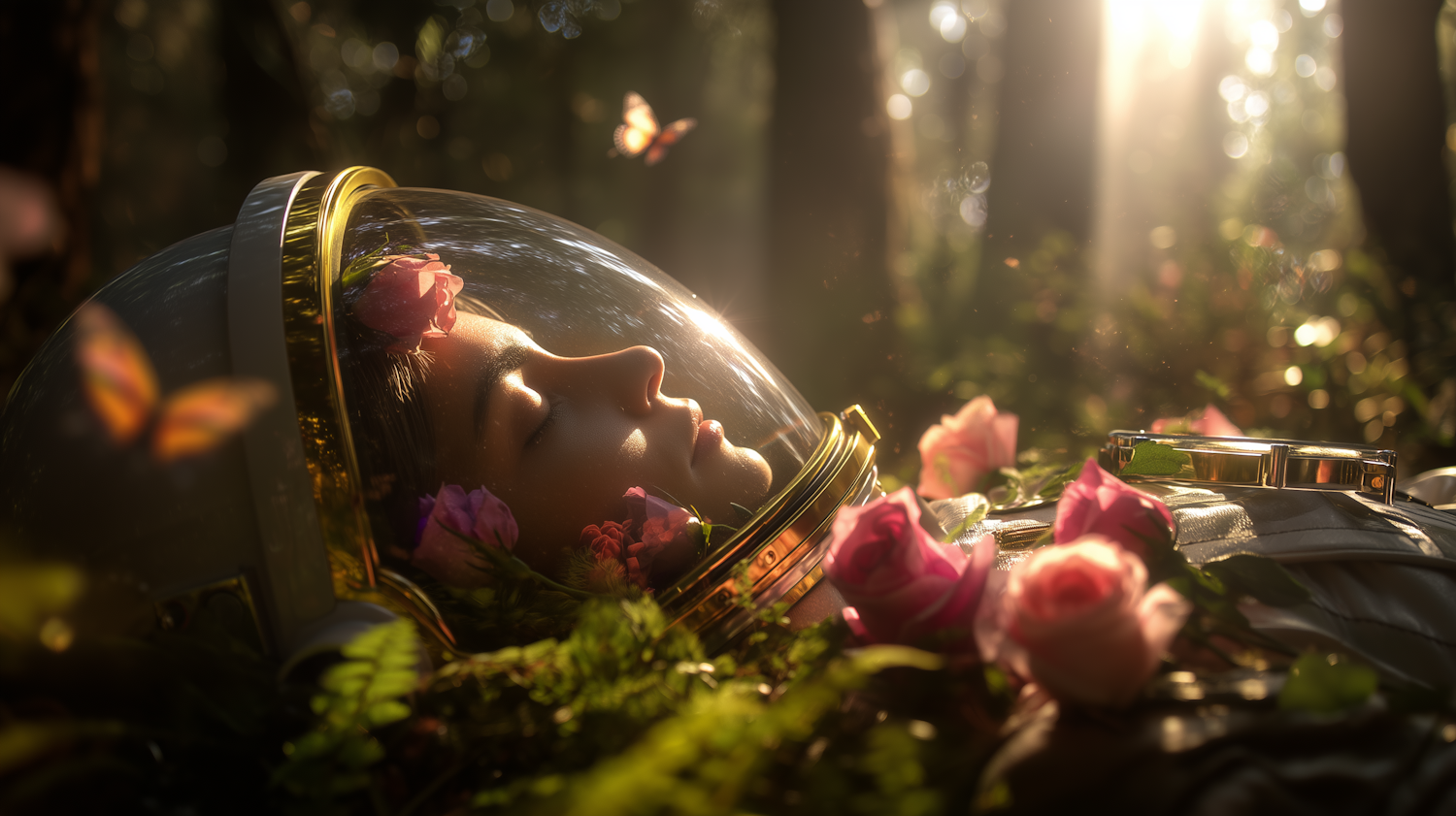 A peaceful astronaut rests in a forest, surrounded by roses and butterflies, with sunlight streaming through the trees.