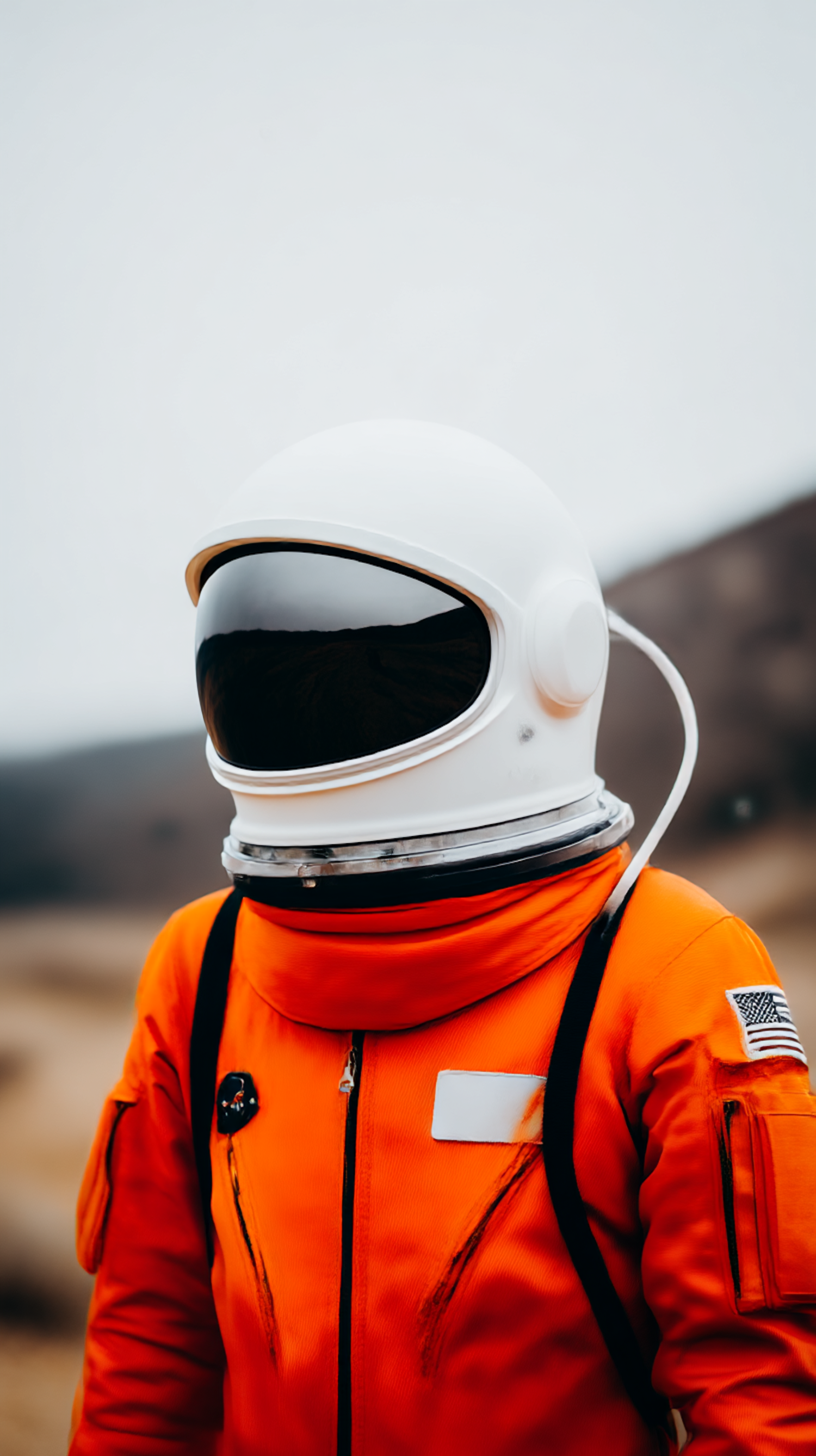 An astronaut in an orange suit with a white helmet stands outdoors, showcasing a reflective visor and an American flag patch.