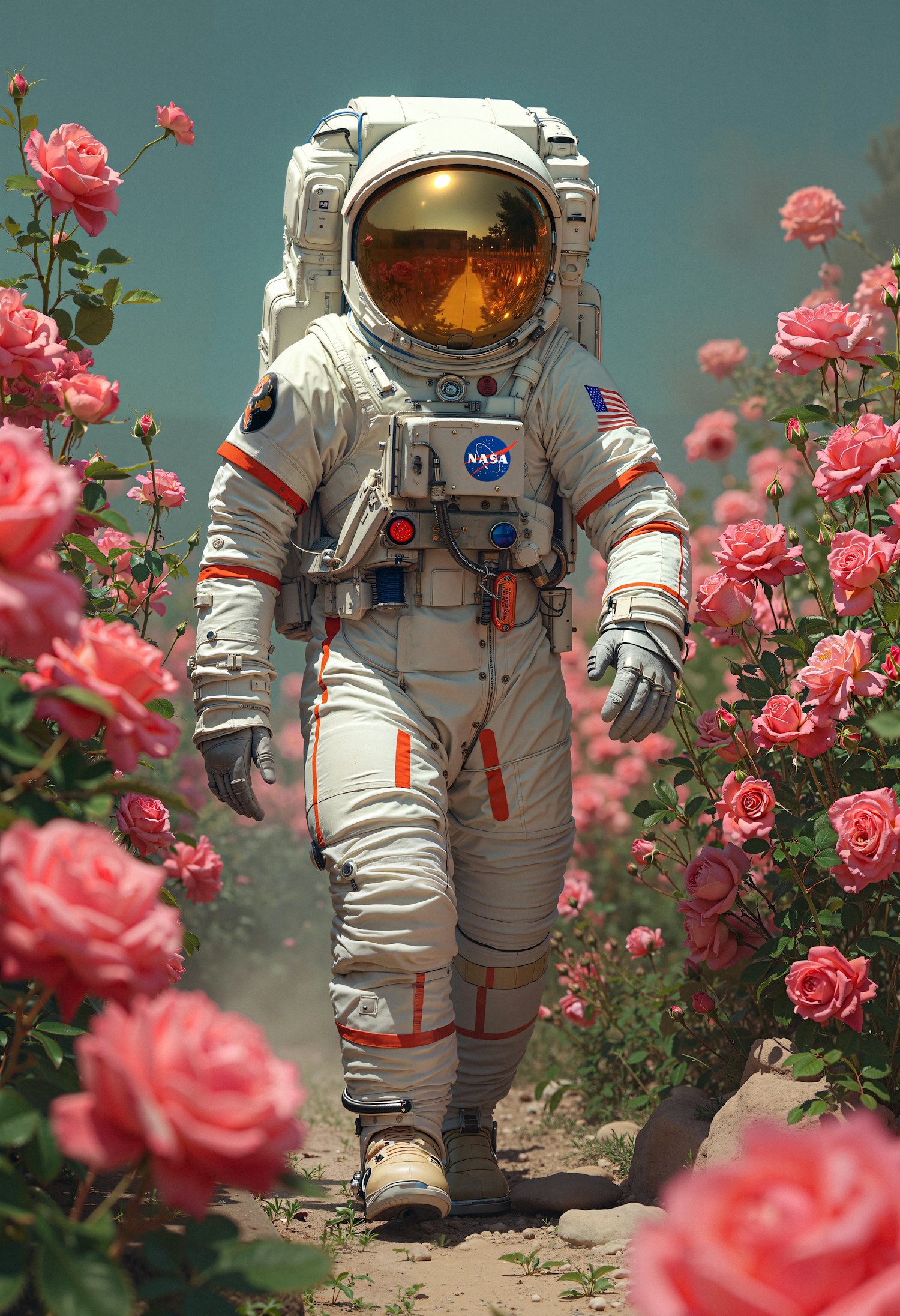 Astronaut in a white suit walks through a garden of pink roses, blending technology with nature in a surreal, vibrant scene.