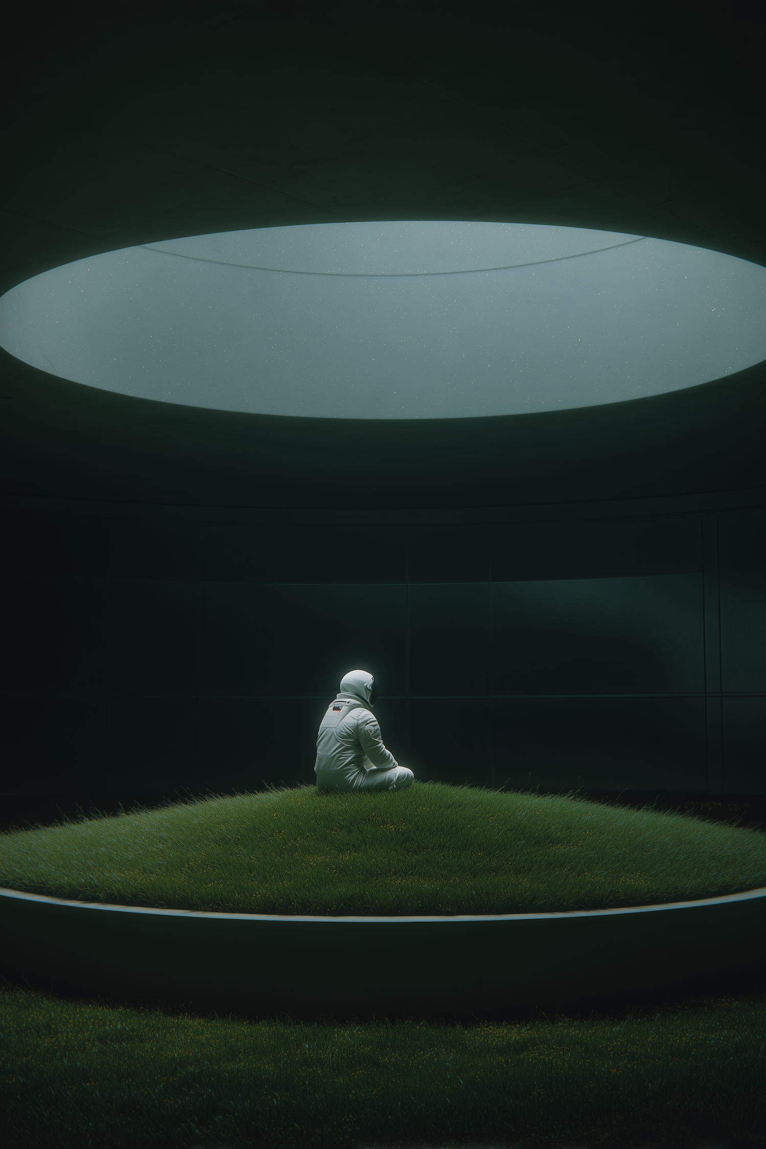 A lone astronaut sits on a grassy mound under a circular skylight, blending nature and futurism in a serene, contemplative setting.