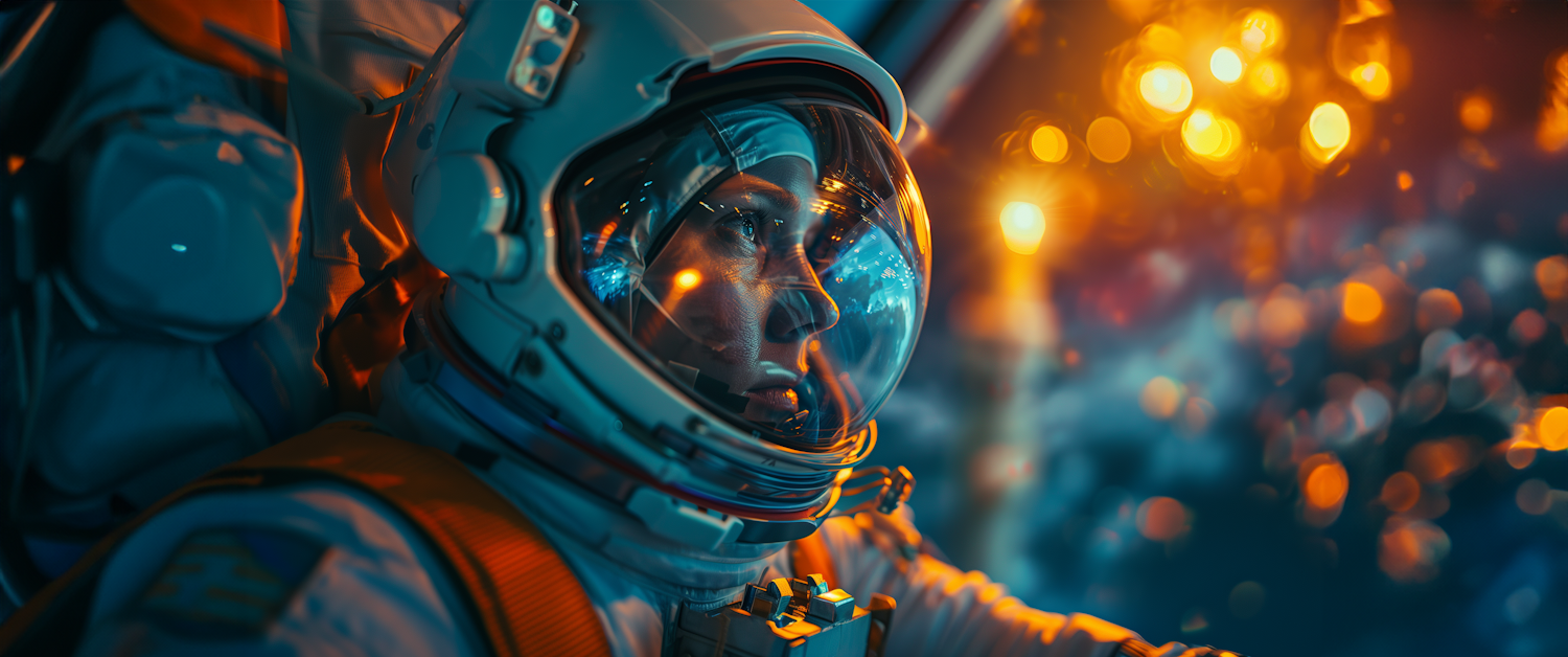 Close-up of an astronaut in a space suit with glowing lights reflecting on the helmet, creating a dramatic and futuristic scene.