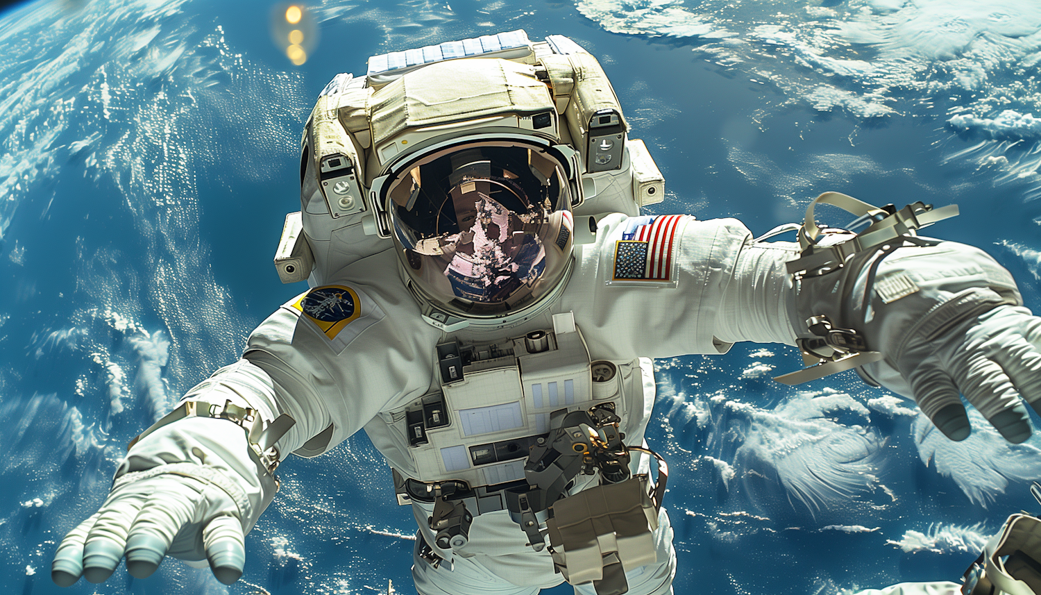 Astronaut in space suit floating above Earth with reflective visor and American flag patch, set against a stunning view of the planet.