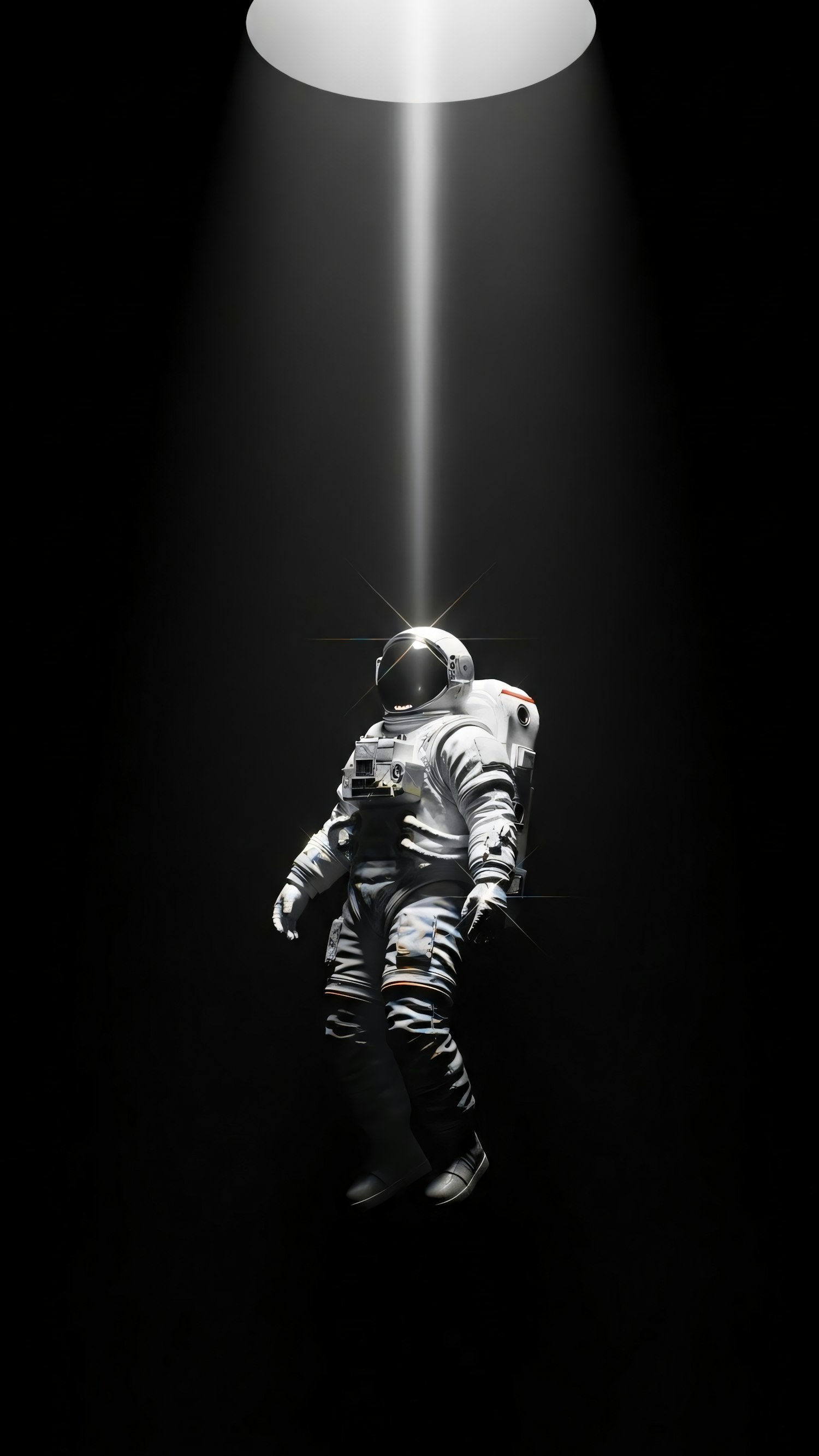 A lone astronaut in a white spacesuit is illuminated by a focused beam of light in a dark, void-like setting.
