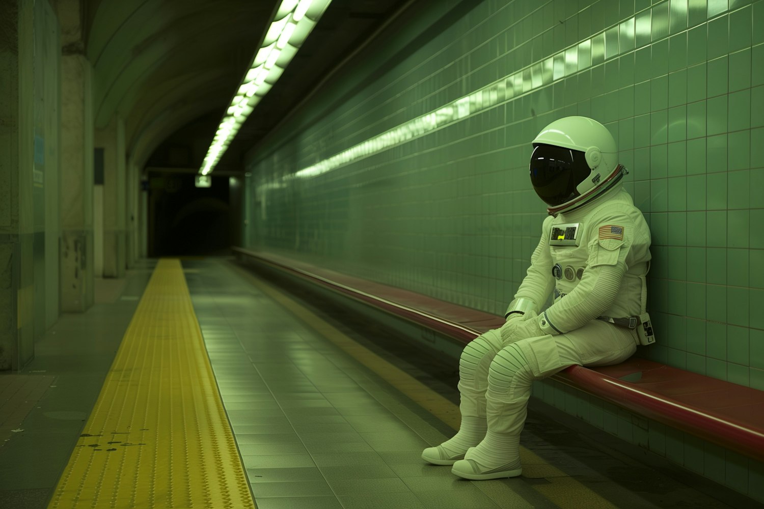 An astronaut in a spacesuit sits alone on a red bench in a green-tiled subway station, creating a surreal and mysterious vibe.