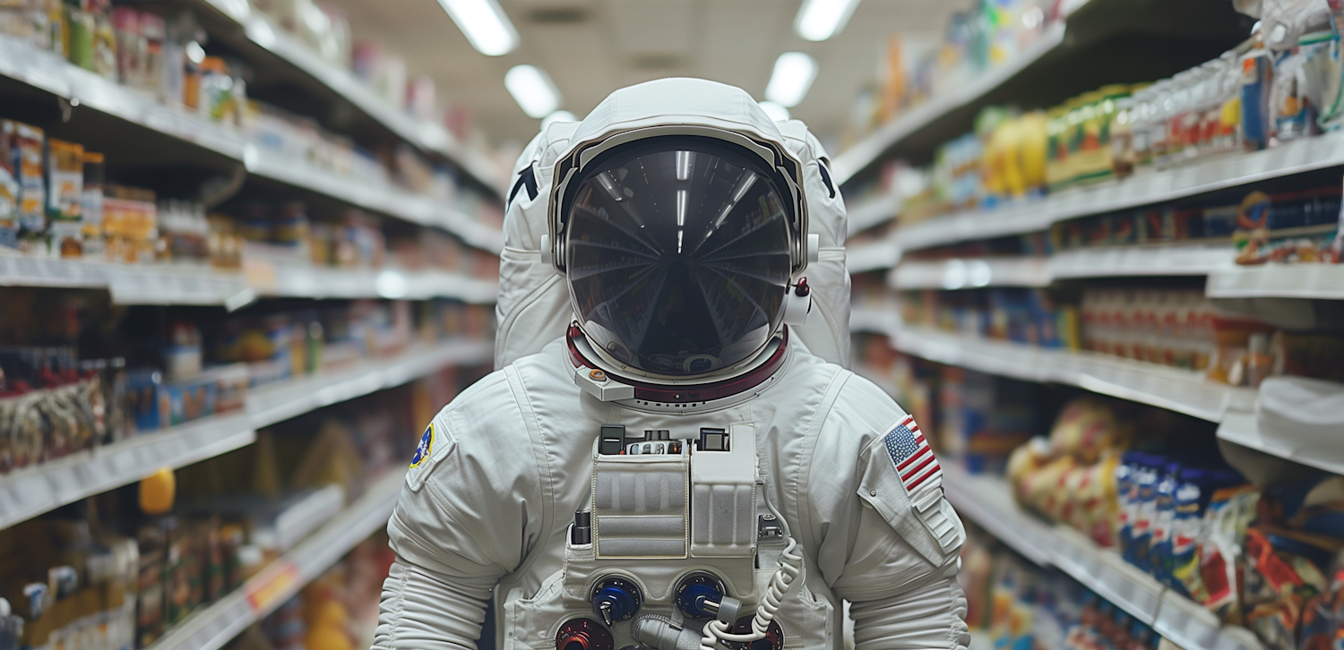 An astronaut in a space suit stands in a grocery store aisle, creating a surreal blend of space exploration and everyday life.