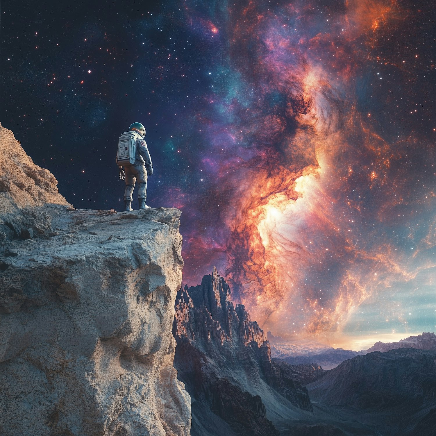 An astronaut on a rocky cliff gazes at a stunning nebula-filled sky, surrounded by alien peaks and valleys. A cosmic adventure awaits.