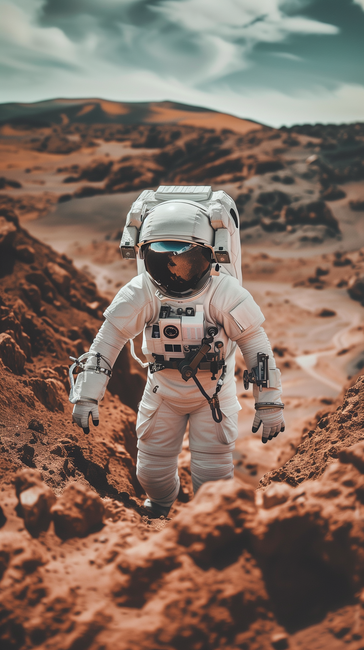 Astronaut in a white suit explores a Mars-like terrain, surrounded by rugged red rocks and a dramatic cloudy sky.