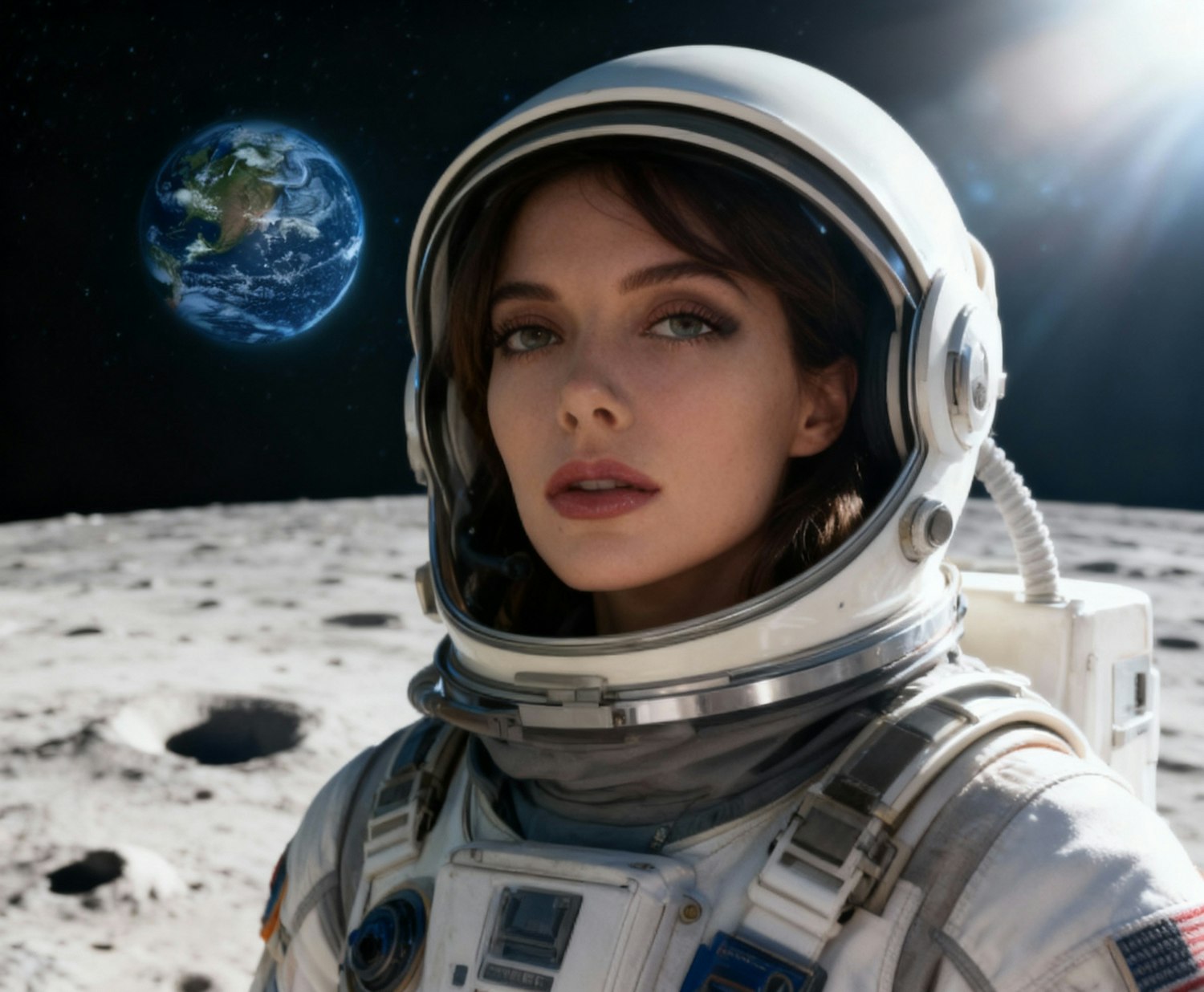 A woman in a spacesuit on the moon with Earth in the background, showcasing the beauty of space exploration.
