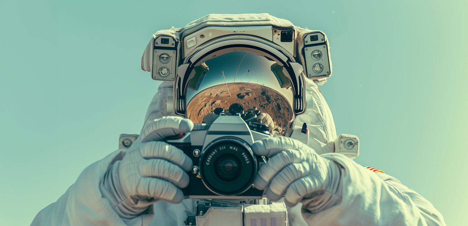 Astronaut in space suit taking a photo with a camera, visor reflecting a rocky landscape. Pale blue sky in the background.