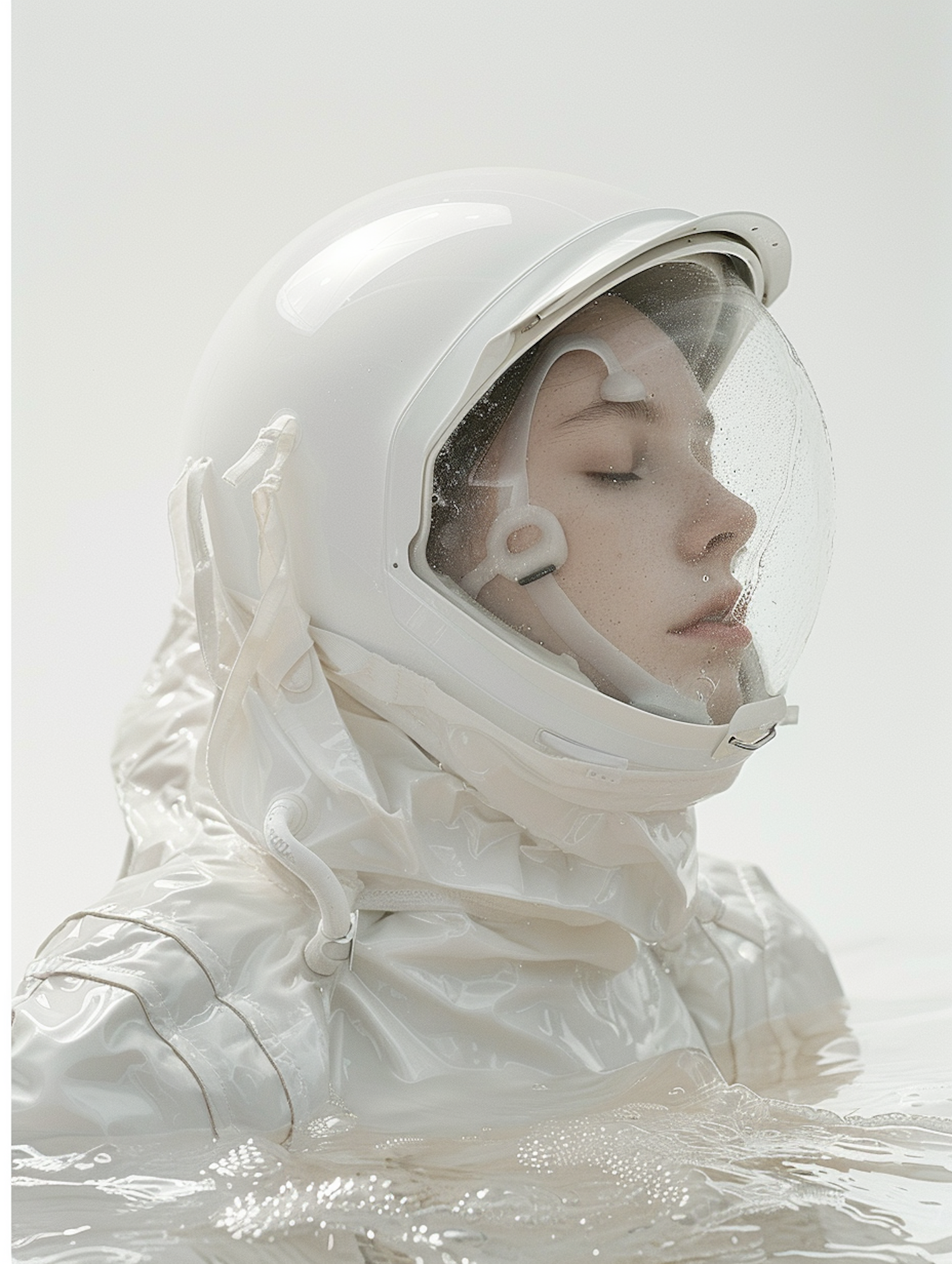 A serene scene of a person in a white astronaut suit, partially submerged in water, with a fogged visor and calm surroundings.