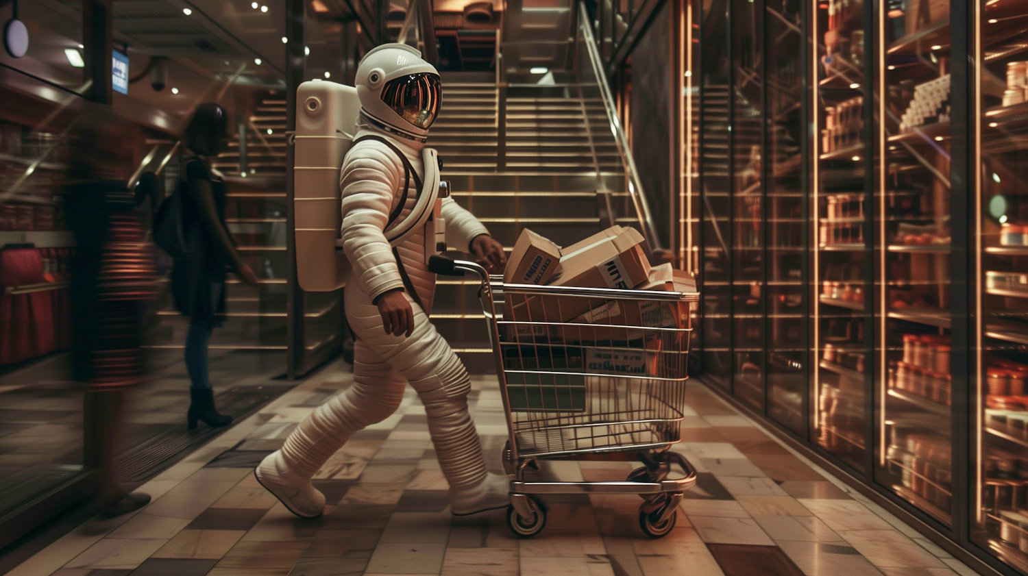 An astronaut in a space suit pushes a shopping cart in a modern store, blending the surreal with everyday life.