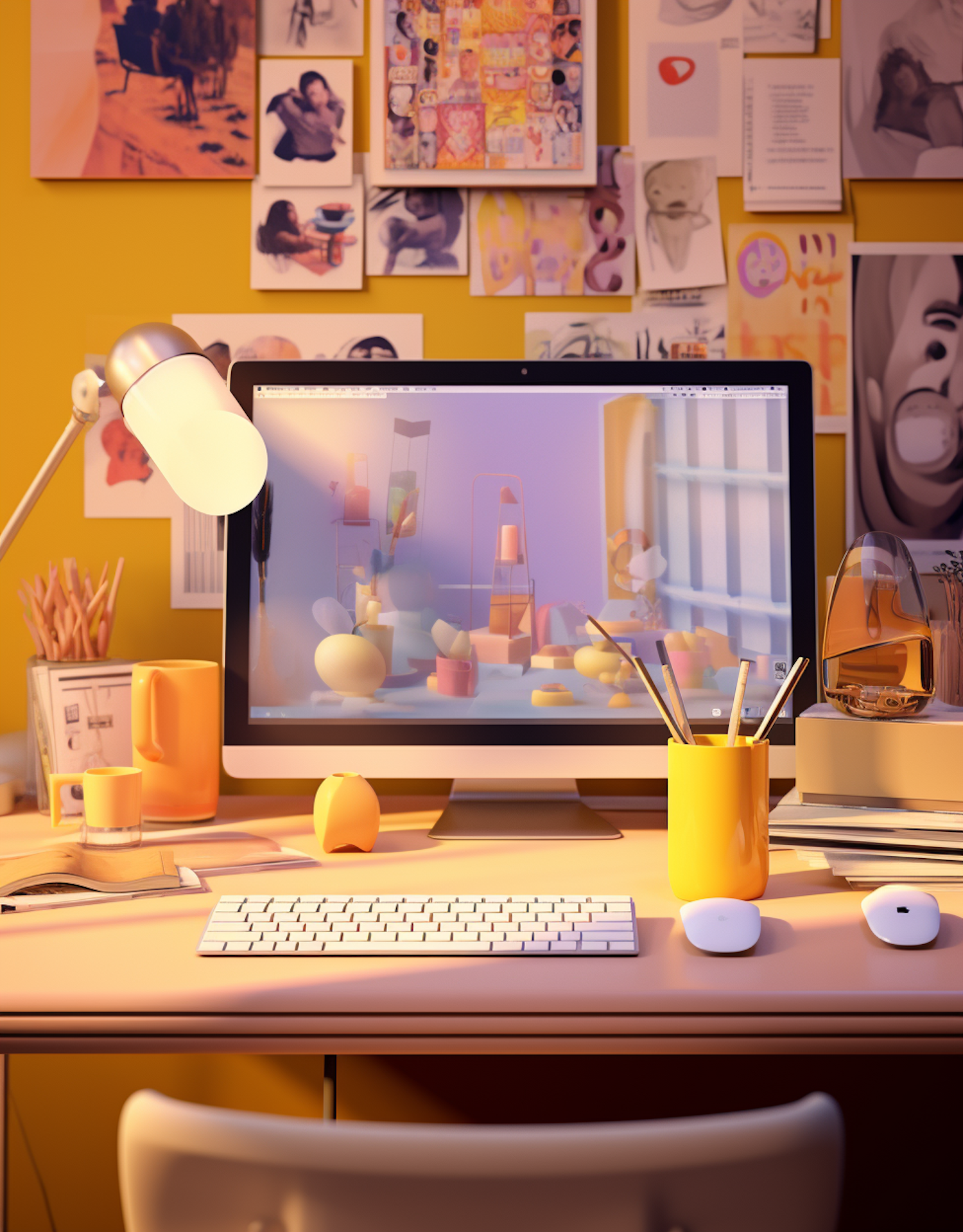 Bright creative workspace with digital art on screen, yellow accents, and art prints on the wall. Inspiring and organized setup.