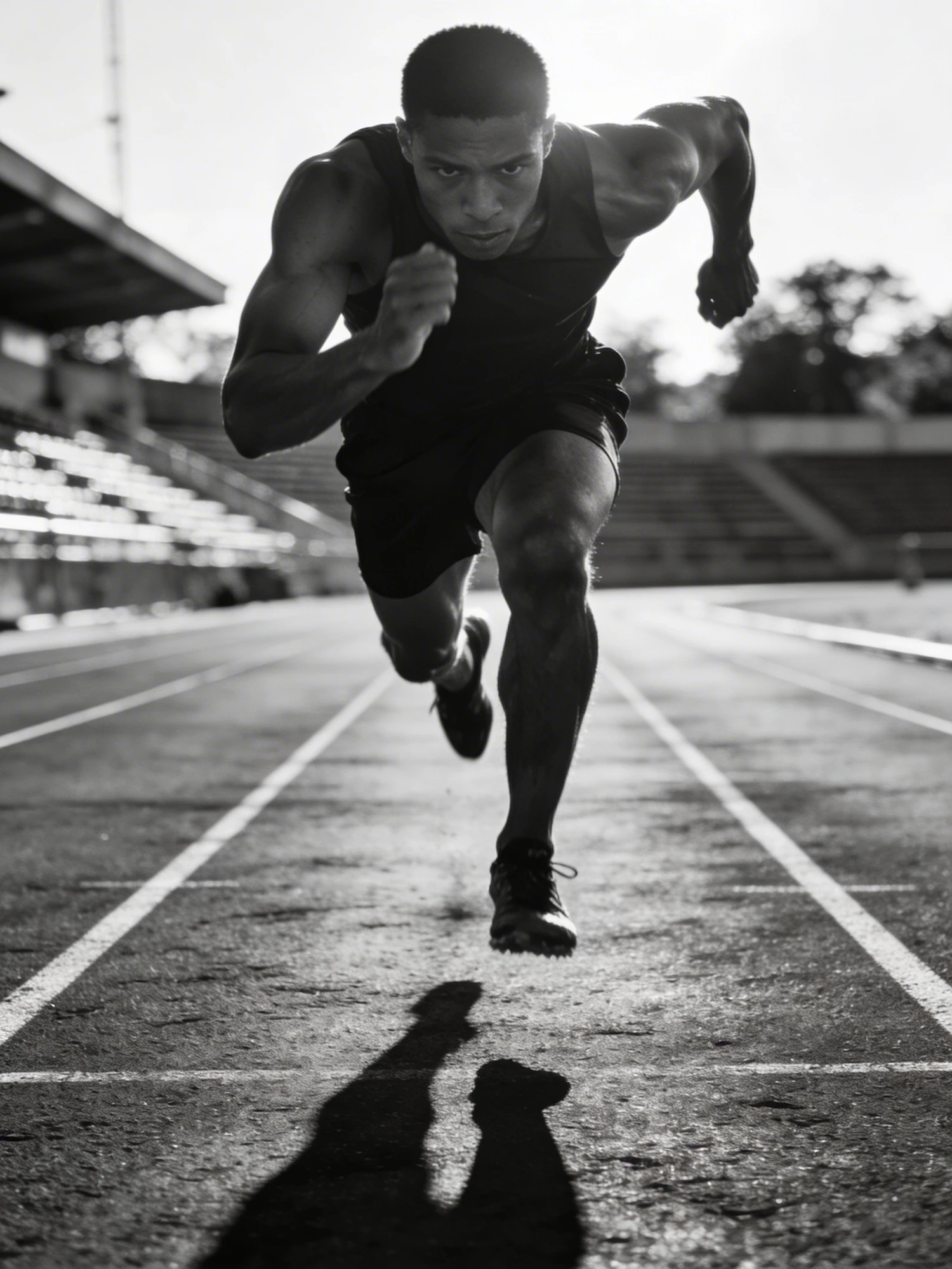 A black-and-white photo of a determined athlete sprinting on a track, showcasing motion, focus, and dramatic lighting.