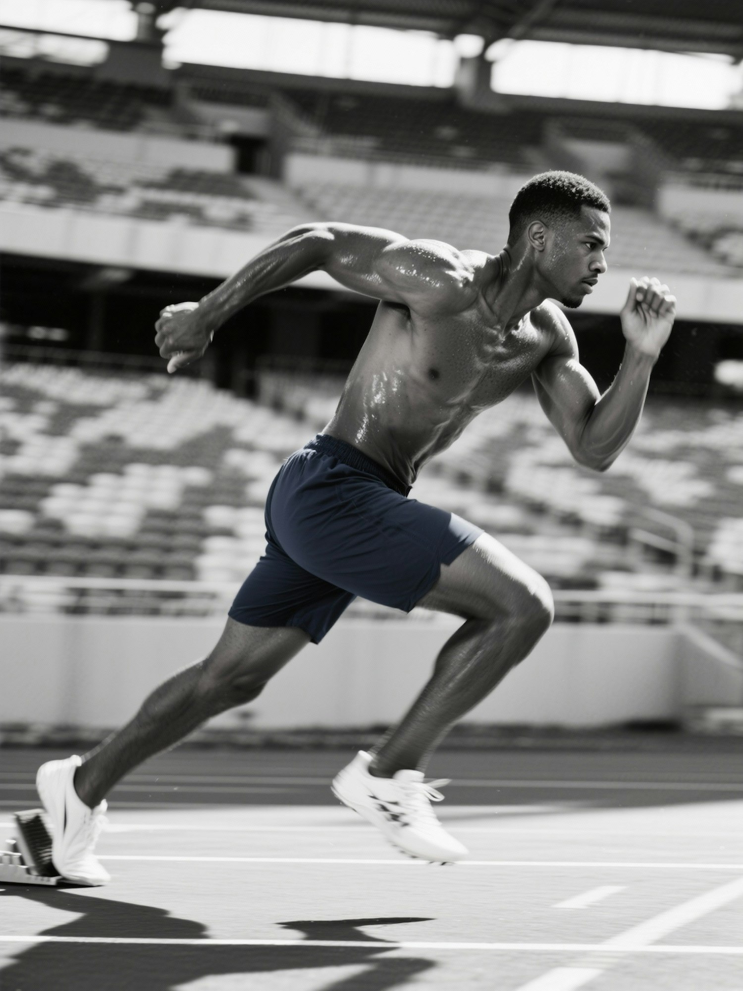 Highly realistic editorial photography, runners in motion, intense daylight, urban environment, dynamic blur, strong contrast, cinematic framing, close-up energy, sporty fashion, aesthetic and modern style, natural colors with metallic accents, editorial sports magazine look. A male sprinter with dark skin and short hair captured mid-stride on an outdoor track. Arms pumping, torso leaning forward, sweat visible. He wears navy shorts and white shoes. The background shows blurred stadium stands. The image is in black and white, dramatic sunlight casting sharp shadows across his body and the ground.