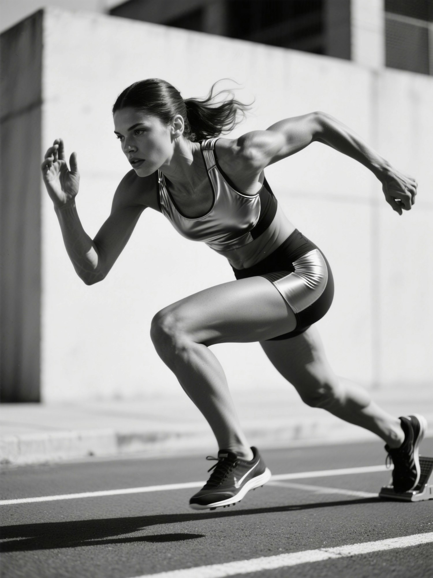 Highly realistic editorial photography, runners in motion, intense daylight, urban environment, dynamic blur, strong contrast, cinematic framing, close-up energy, minimal background, sporty fashion, aesthetic and modern style, natural colors with metallic accents, editorial sports magazine look. Black and white shot of a female athlete in explosive sprint start, body stretched forward mid-air, muscles defined, dramatic shadows, minimalist clean background, intense focus on energy.