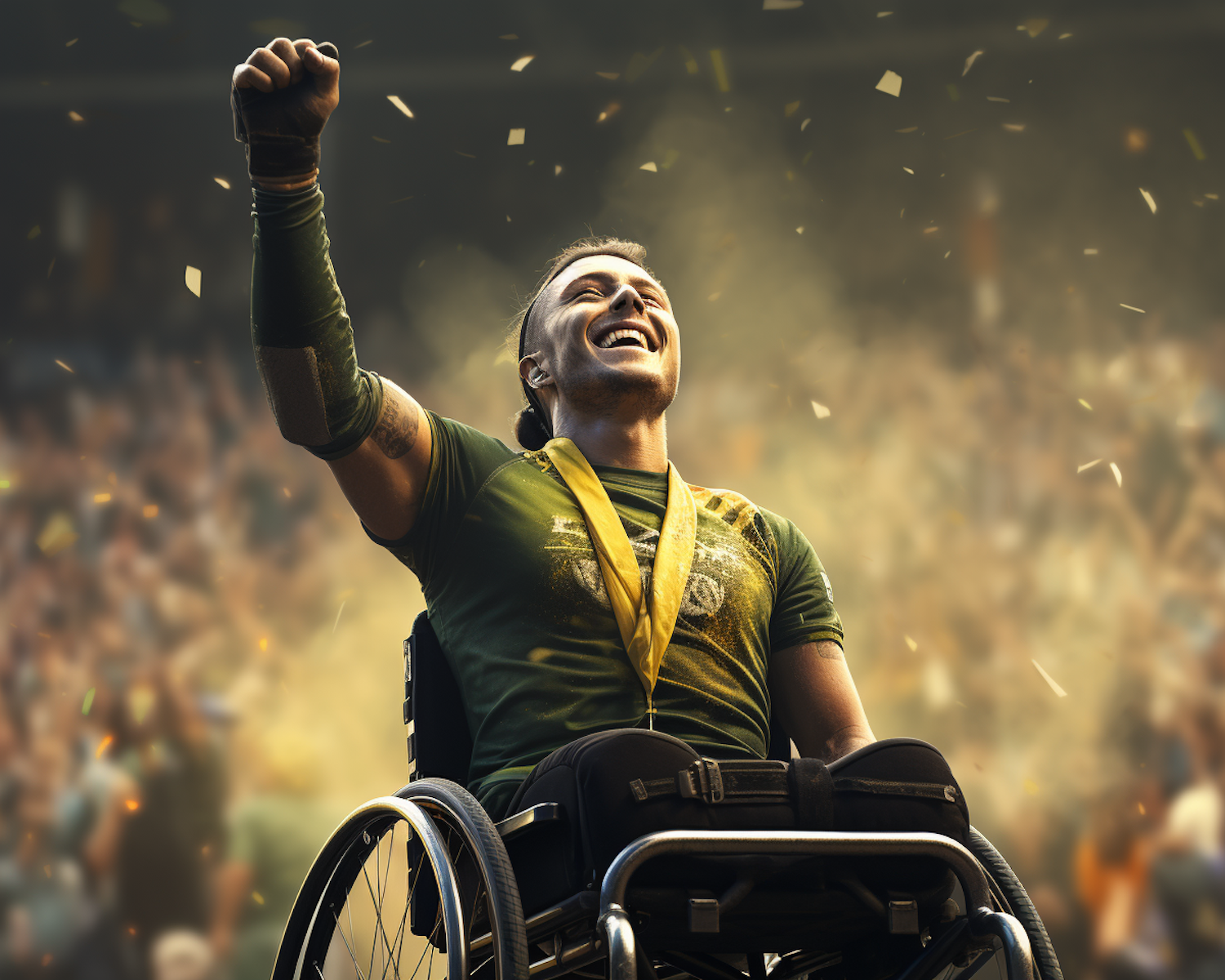Triumphant athlete in a wheelchair celebrates victory with a gold medal, surrounded by cheering crowd and falling confetti.