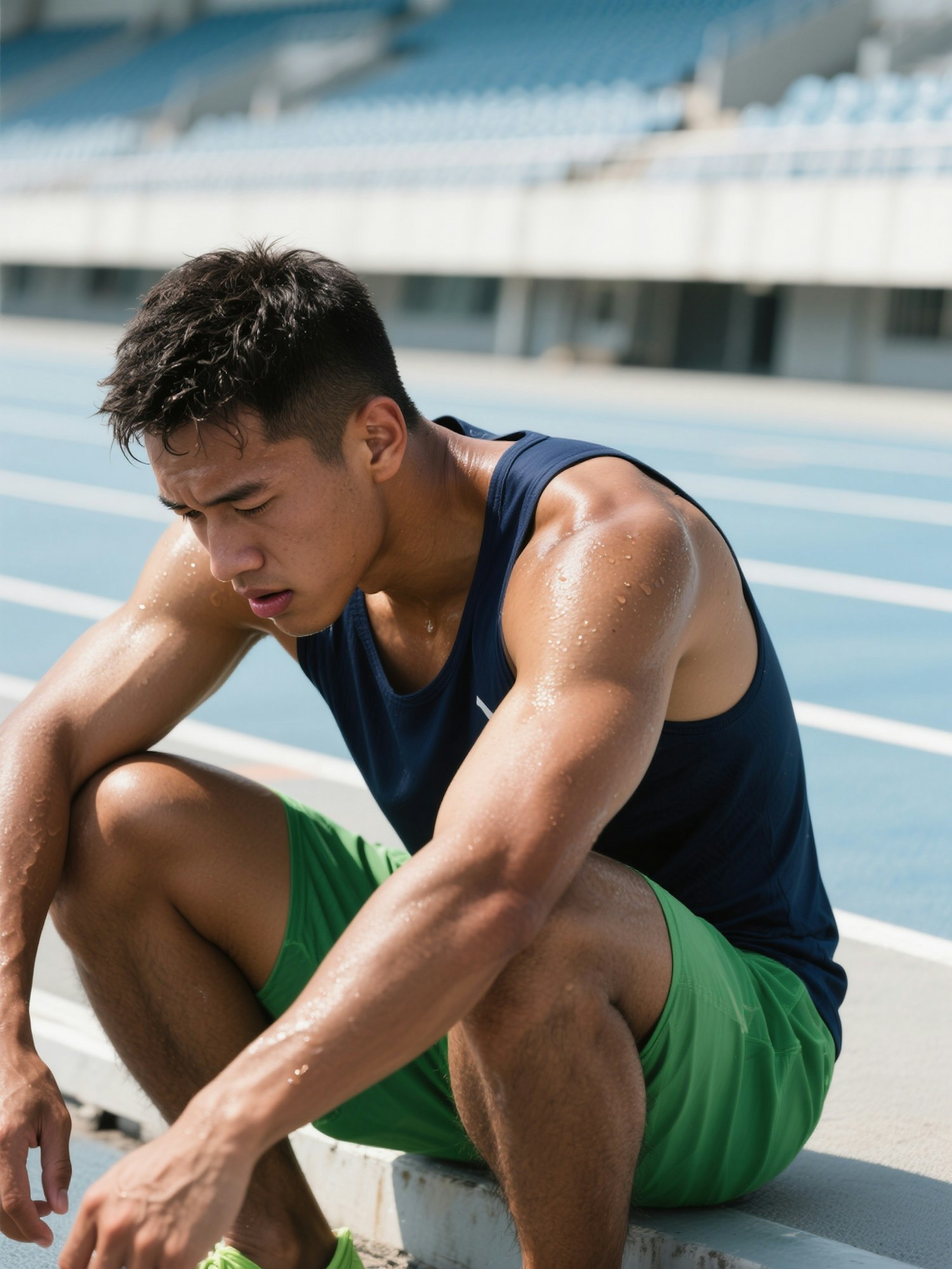 A young athlete rests on a track, wearing a navy tank top and green shorts, with sweat glistening under the sun.