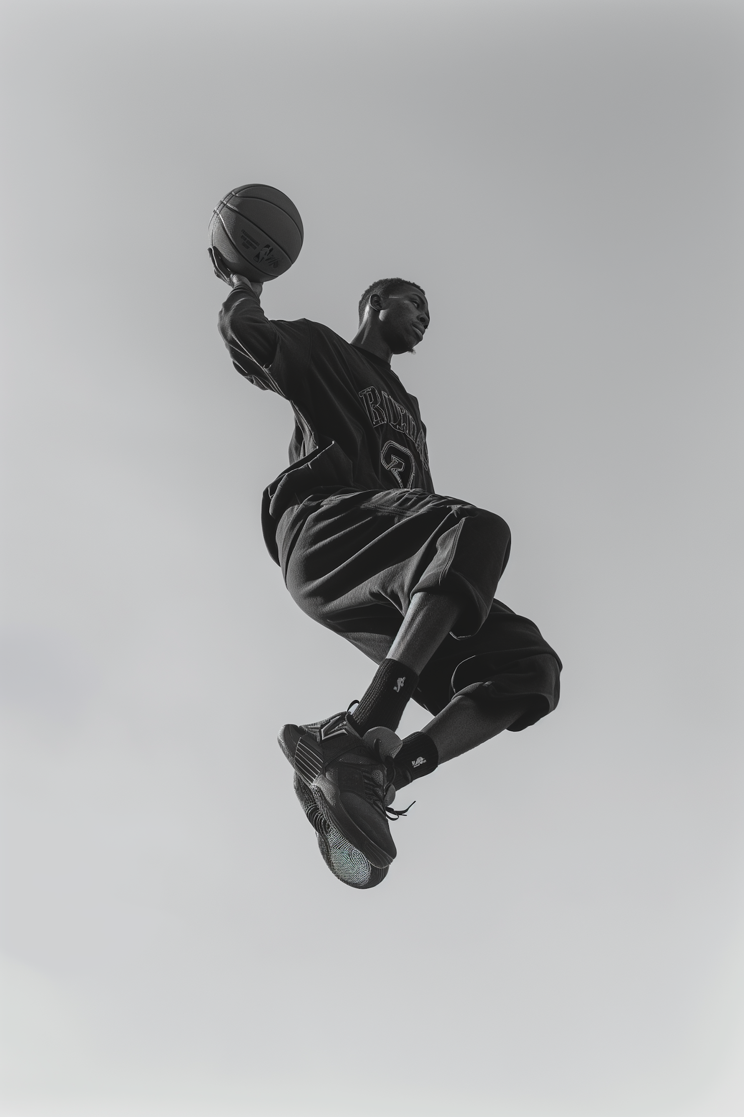 Dynamic black and white shot of a basketball player mid-air, showcasing athleticism and focus against a clear sky.