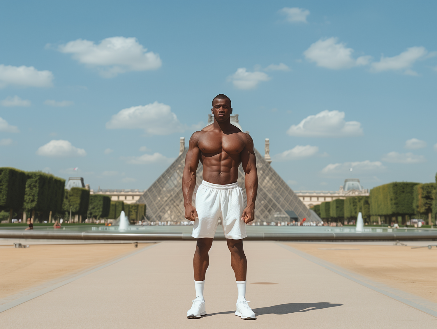 Muscular man in white shorts stands confidently in front of the Louvre Pyramid, blending modern athleticism with classic architecture.