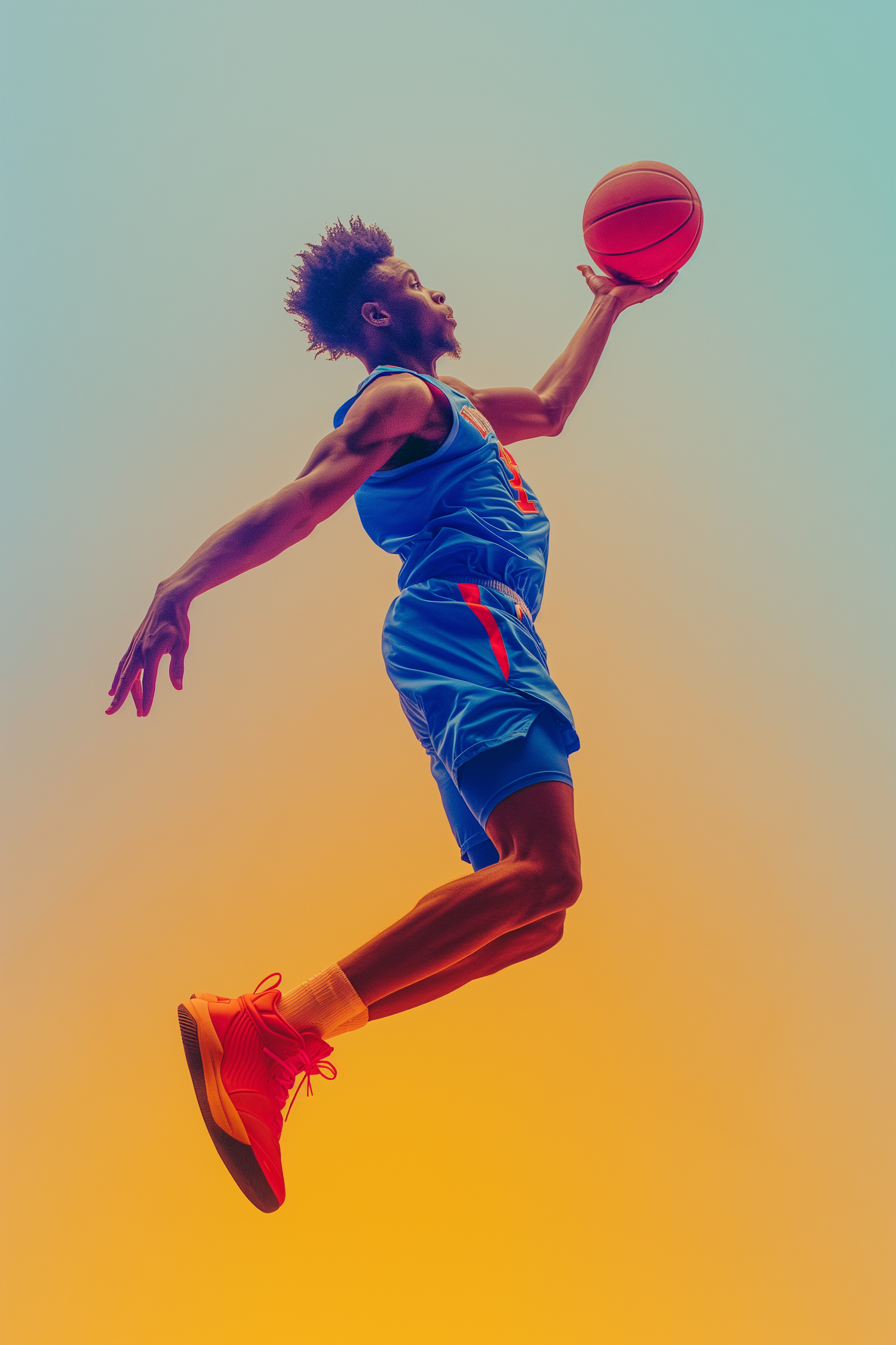 Dynamic shot of a basketball player in mid-air, wearing a blue jersey and orange sneakers, against a vibrant gradient background.